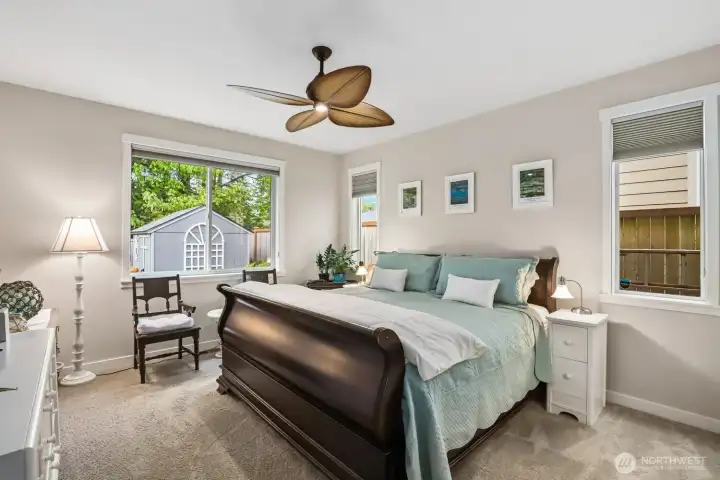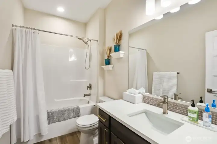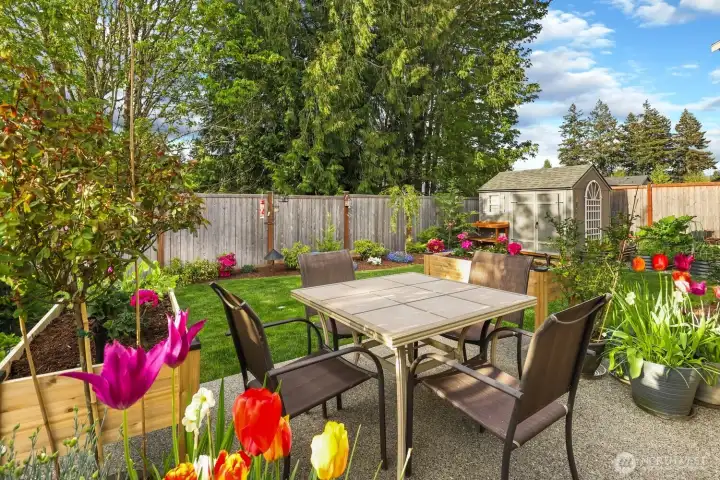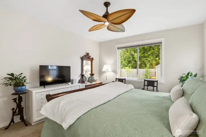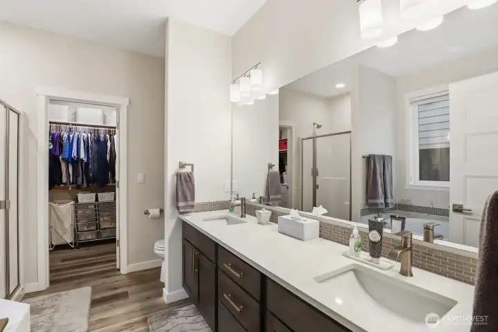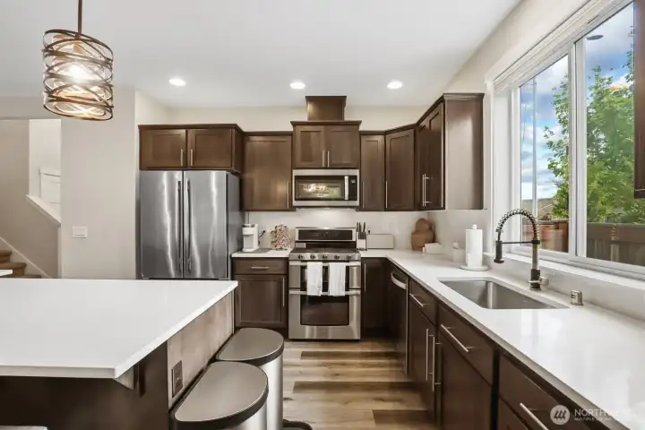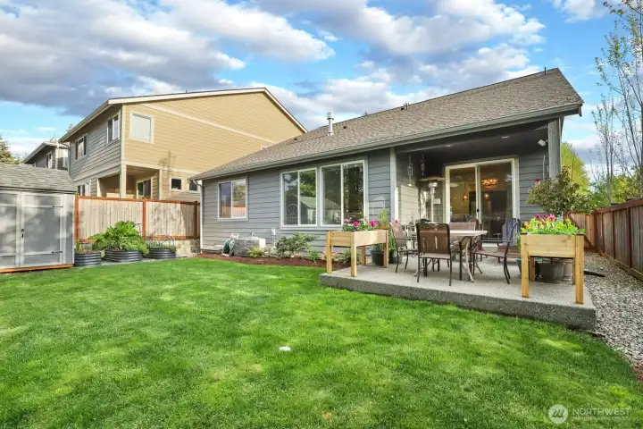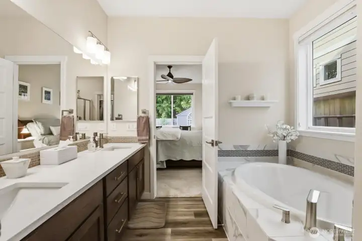 Luxury, privacy, and convenience in this better-than-new, move-in ready 4-bedroom, 3-bath Rob Rice built home in the highly desirable Bradbury Div 1 community. Perfectly positioned on one of the most private lots in the neighborhood, this home offers a peaceful setting while still being just minutes from schools, shopping, and dining. The main-level primary suite is a true retreat, featuring a spa-inspired 5-piece bath with soaking tub. The gourmet kitchen is designed for both everyday living and entertaining, complete with quartz countertops, an oversized island, stainless steel appliances, double oven with gas range, and soft-close cabinetry. Thoughtfully upgraded throughout, this home includes an integrated vacuum system, new air conditioner, tankless gas water heater, upgraded upstairs carpet, luxury vinyl flooring, washer and dryer, and beautiful custom light fixtures. The fully fenced and landscaped yard, raised garden beds with irrigation, sprinkler system provides the perfect outdoor space for relaxation or gatherings. Located within the highly sought-after Tumwater School District, this pristine home truly offers the perfect blend of comfort, style, and location