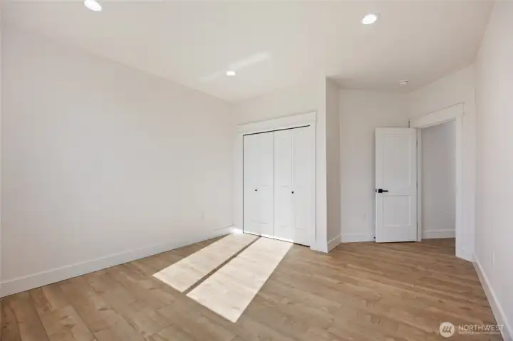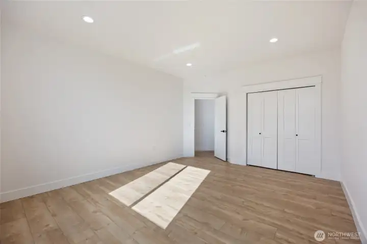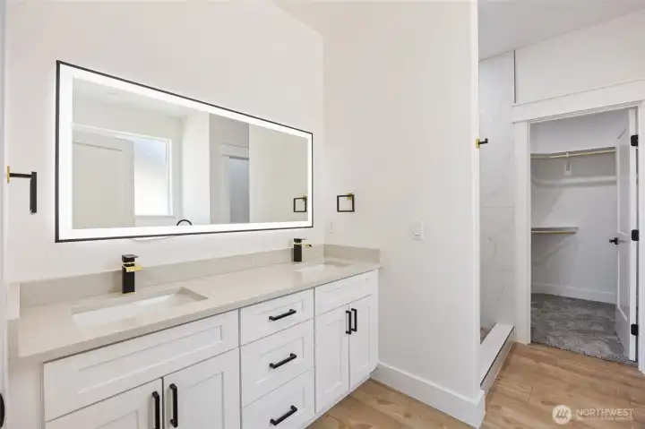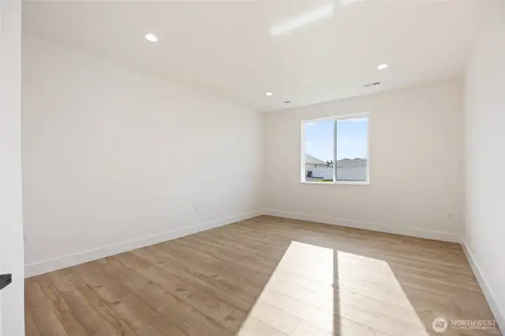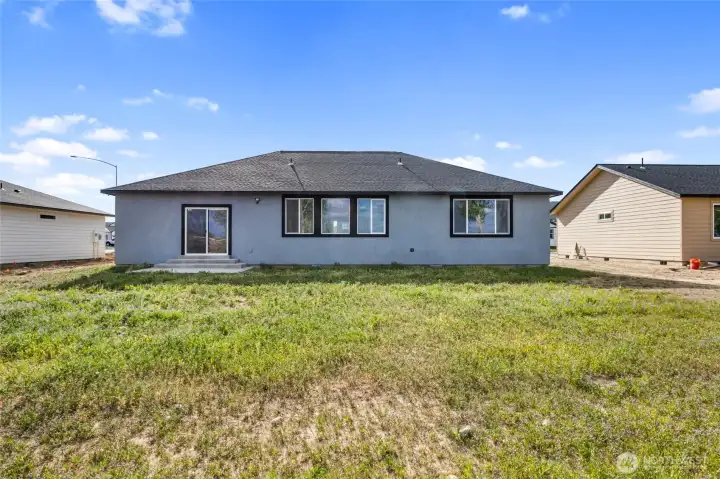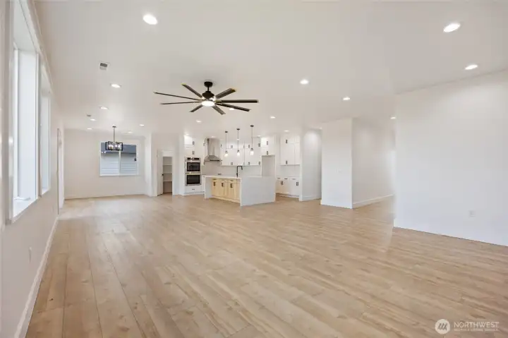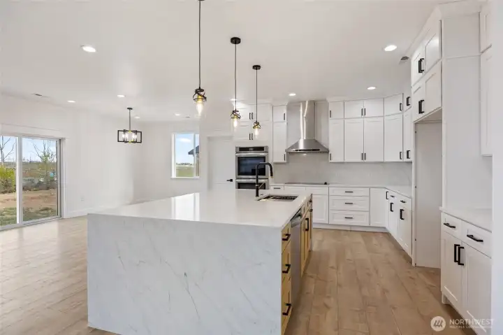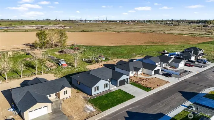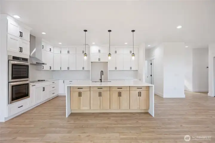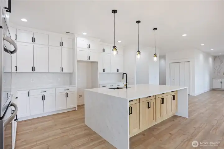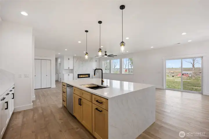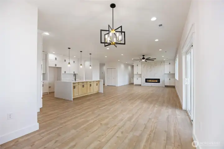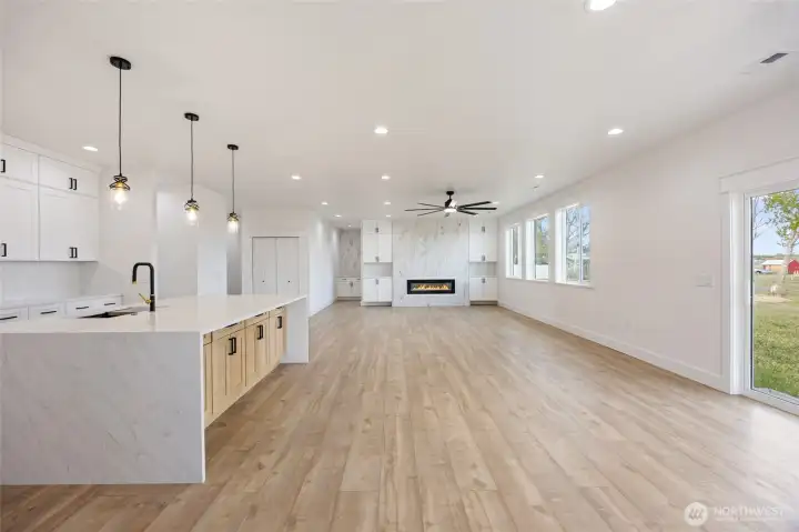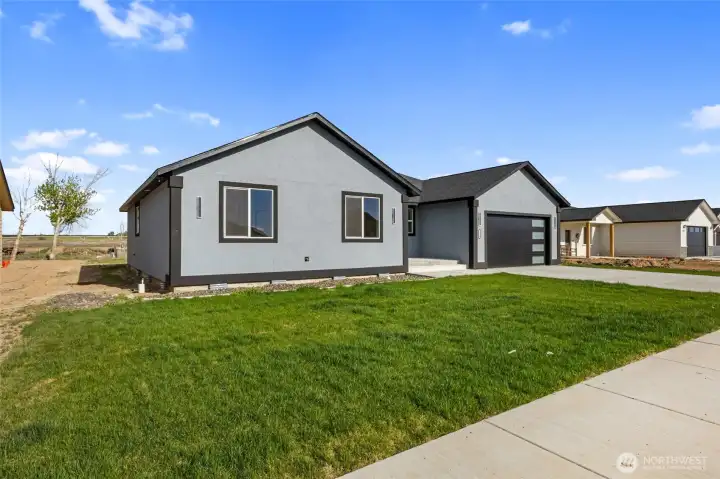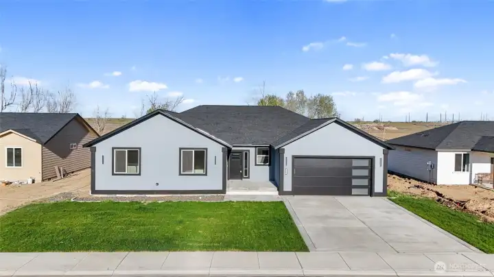 Beautiful new construction offering 3 bedrooms and 2.25 bathrooms with a functional single-level layout. The open-concept design creates an inviting flow between the kitchen, dining, and living spaces, ideal for both everyday living and entertaining. The kitchen features a large quartz island, sleek cabinetry, double ovens, a walk-in pantry, and generous prep space. Vinyl plank flooring runs throughout the main living areas for style and durability. The spacious primary suite includes a walk-in closet, bath off primary, double-sink vanity, soaking tub, and tiled shower. Additional features include an electric fireplace, attached 2-car garage, paved street access, and attractive stucco exterior.