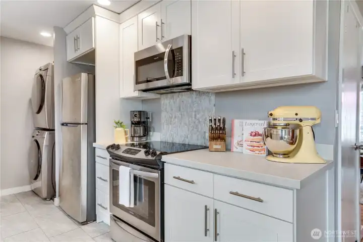 The updated kitchen features tile flooring, quartz countertops, and stainless steel appliances