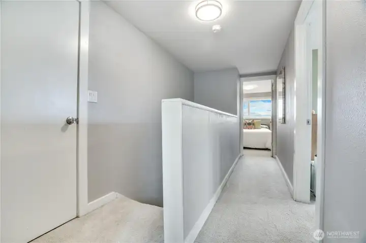 Upstairs, the primary bedroom offers added privacy