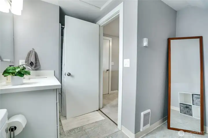 Main floor full bath with tile flooring and quartz countertops