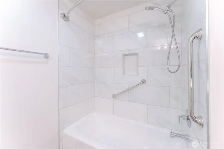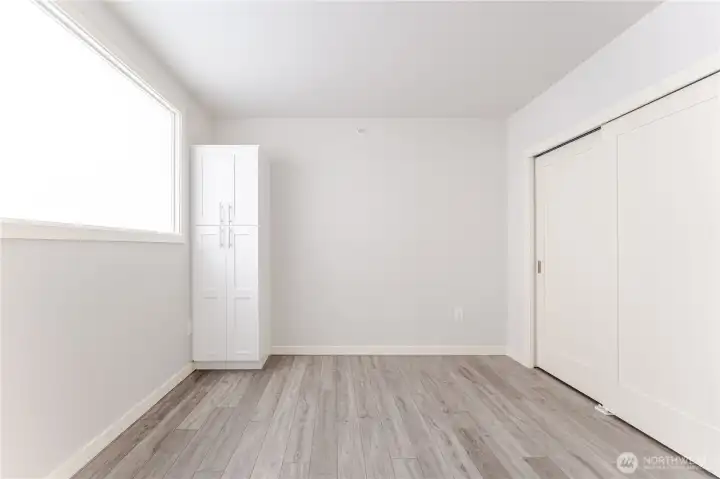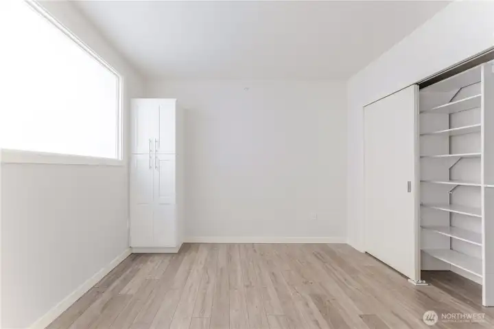 Built-in storage and California-style closets enhance the functionality and organization of the space. (virtually staged)