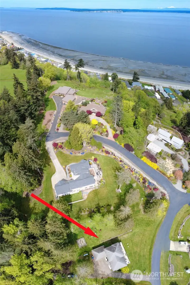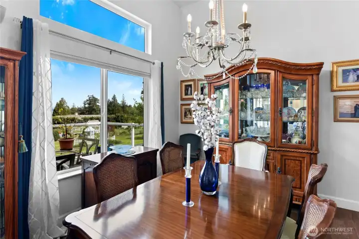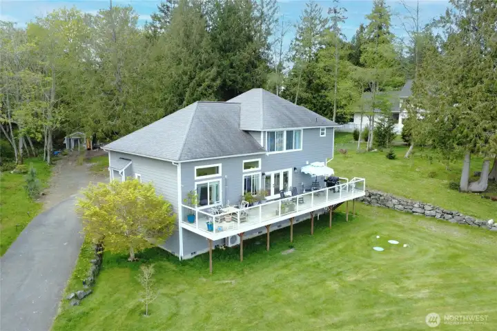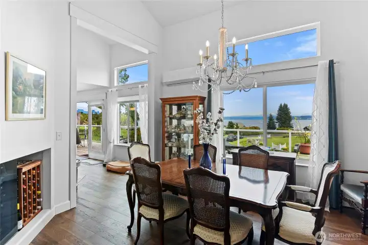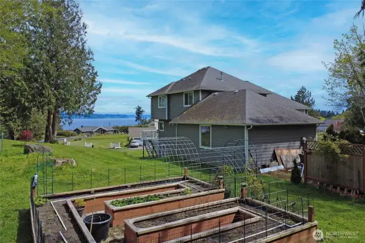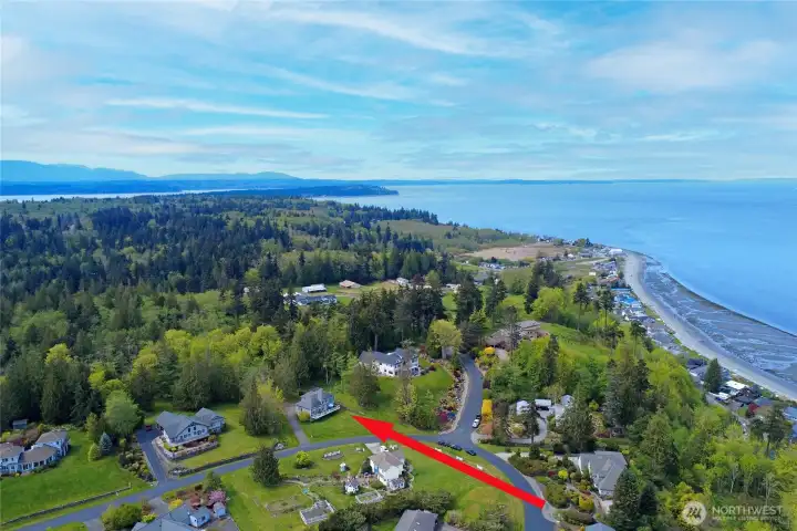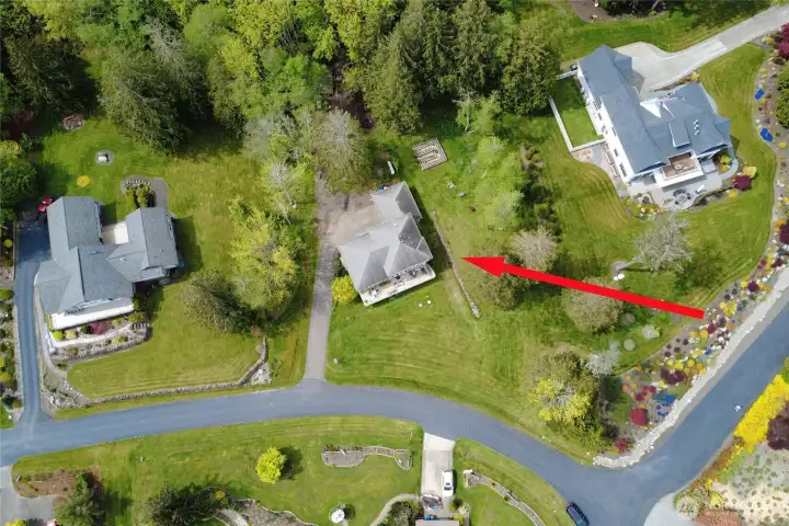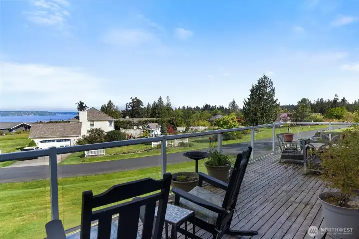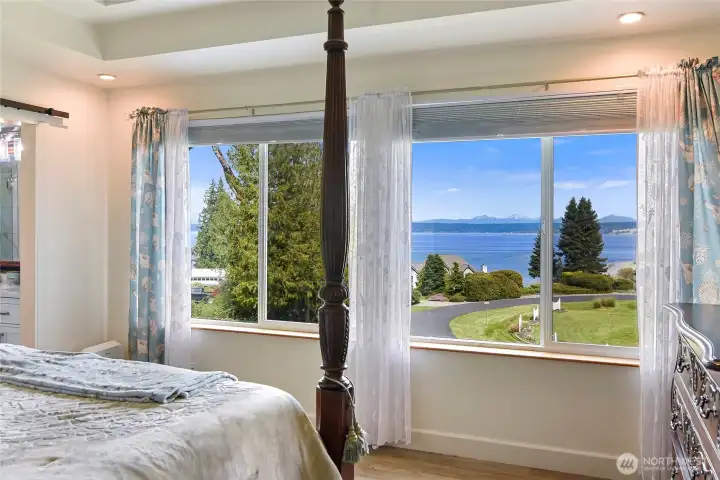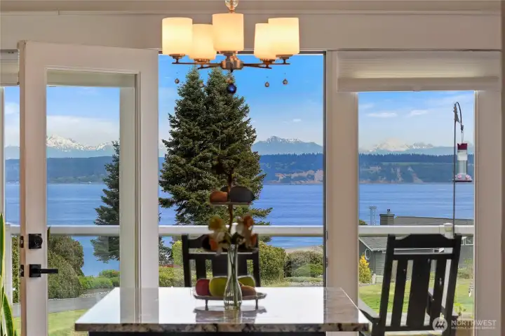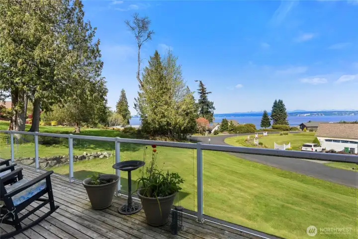 Set on nearly an acre in a gated community, This view-driven property captures sweeping vistas of the shipping lanes and Cascade Mountains. The 3-bedroom, 2.5 bath home is filled with natural light from expansive windows and features a marble foyer, rich hickory plank flooring, and a gas fireplace with custom mantel anchoring the main living space. A formal dining room with chandelier adds a refined touch. All The interior is recently updated -kitchen offers a custom breakfast bar, granite countertops, double ovens, and a professional 48-inch gas range—all positioned to take in the views. The main level also includes a den/office,.5 bath, separate laundry, and access to the 2-car garage with extra storage, a custom wood and wrought iron staircase leads to the primary suite with stunning views, a walk-in closet, and a spacious 5-piece bath Also tasteful use of marble and quartz throughout home. Two additional bedrooms and a full bath complete the upper level. Outdoors, enjoy a paved driveway, 40’ greenbelt buffer, nine fruit trees, raised garden beds, a 12x16 shed. Offering privacy & security-a great place to live.
