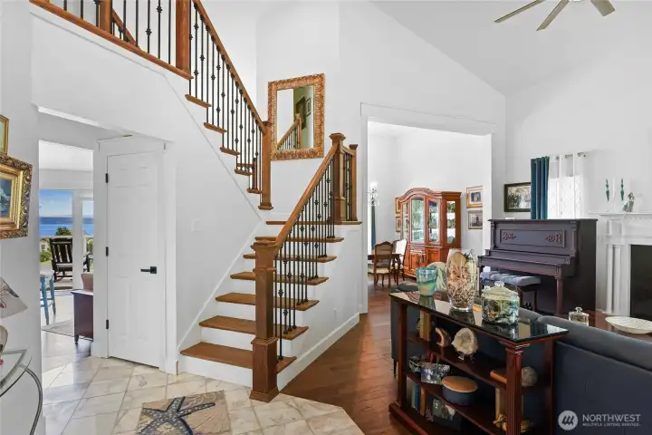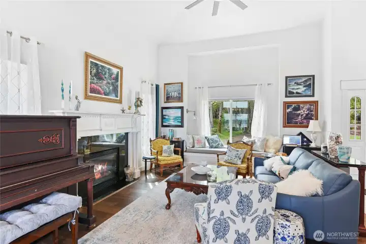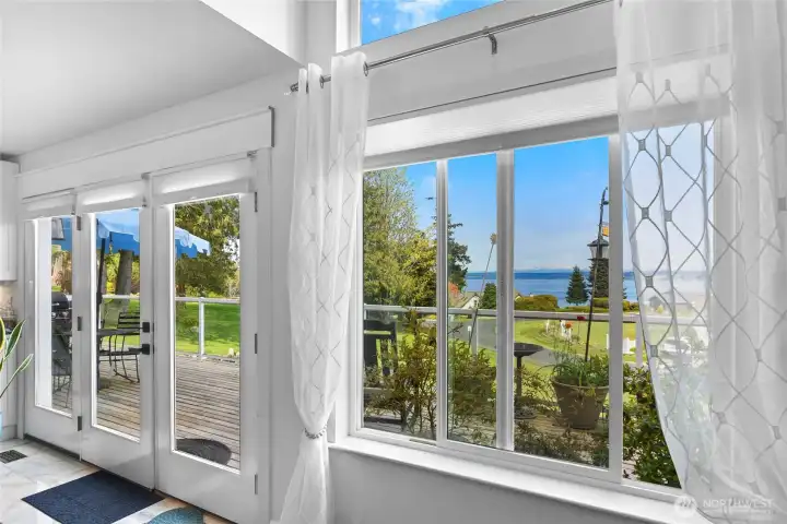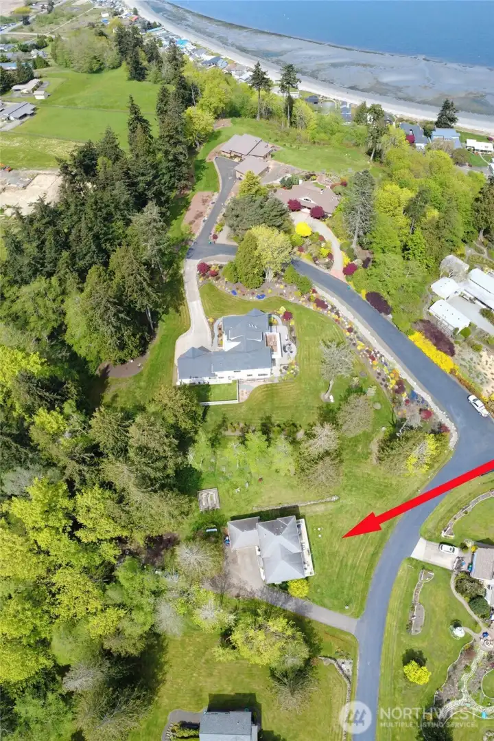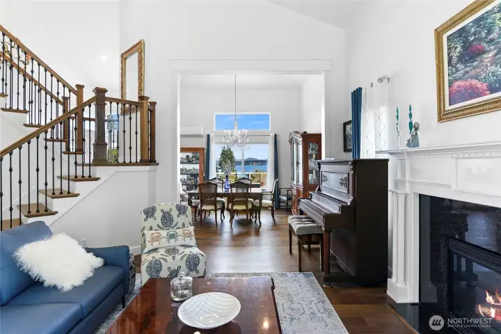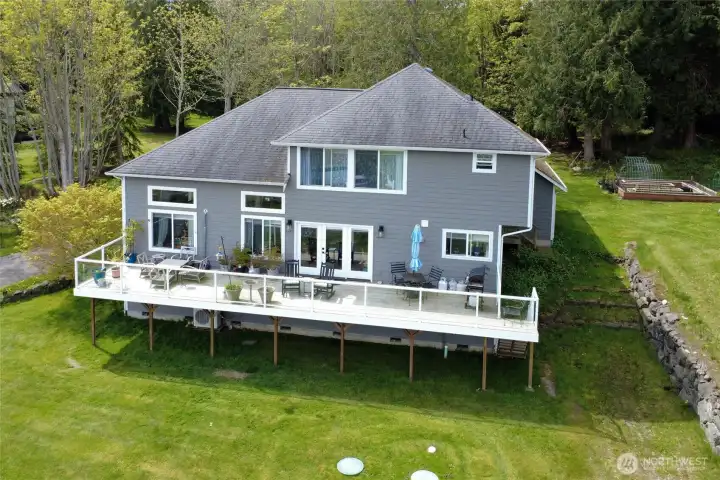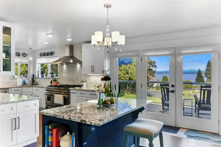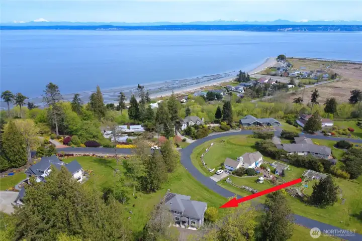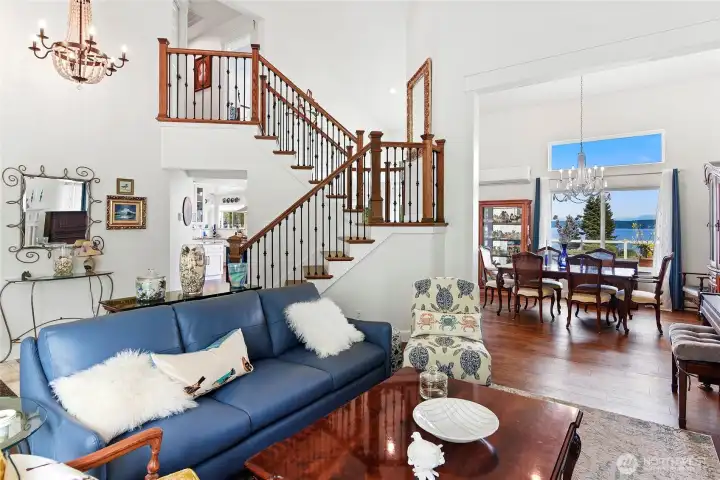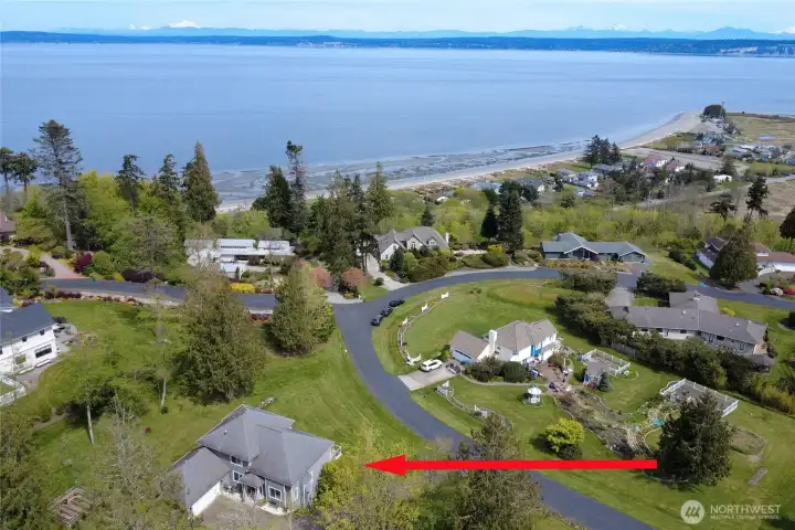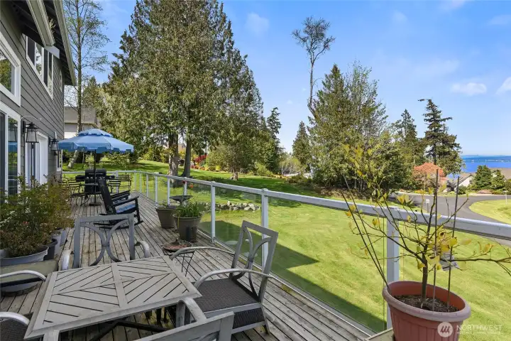 Set on nearly an acre in a gated community, This view-driven property captures sweeping vistas of the shipping lanes and Cascade Mountains. The 3-bedroom, 2.5 bath home is filled with natural light from expansive windows and features a marble foyer, rich hickory plank flooring, and a gas fireplace with custom mantel anchoring the main living space. A formal dining room with chandelier adds a refined touch. All The interior is recently updated -kitchen offers a custom breakfast bar, granite countertops, double ovens, and a professional 48-inch gas range—all positioned to take in the views. The main level also includes a den/office,.5 bath, separate laundry, and access to the 2-car garage with extra storage, a custom wood and wrought iron staircase leads to the primary suite with stunning views, a walk-in closet, and a spacious 5-piece bath Also tasteful use of marble and quartz throughout home. Two additional bedrooms and a full bath complete the upper level. Outdoors, enjoy a paved driveway, 40’ greenbelt buffer, nine fruit trees, raised garden beds, a 12x16 shed. Offering privacy & security-a great place to live.