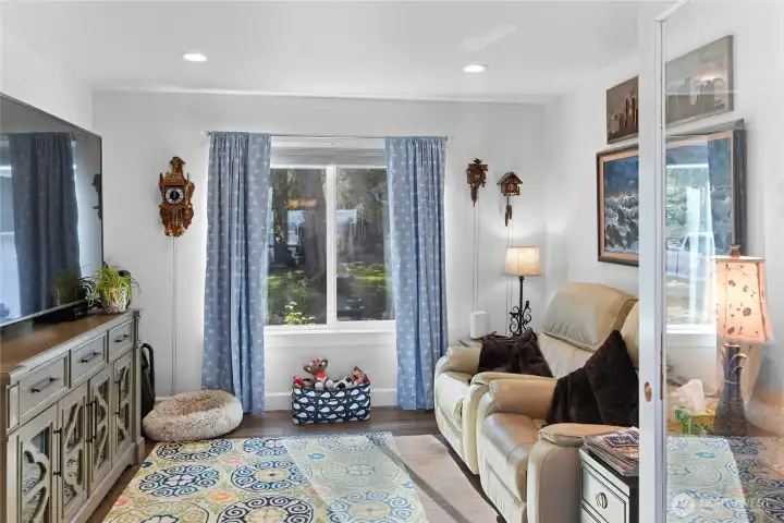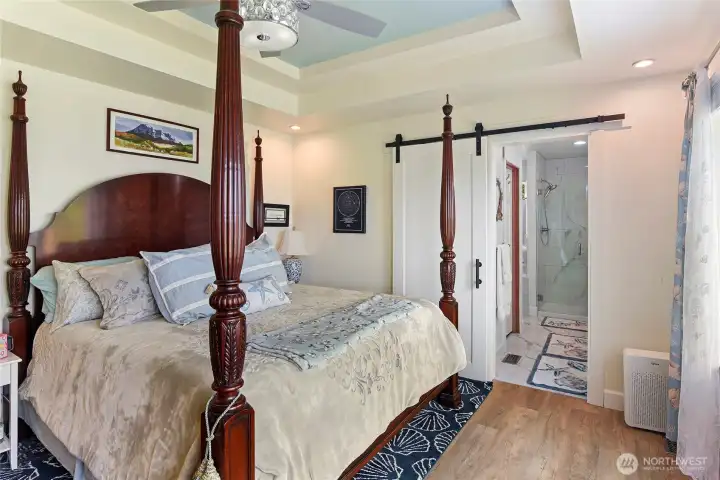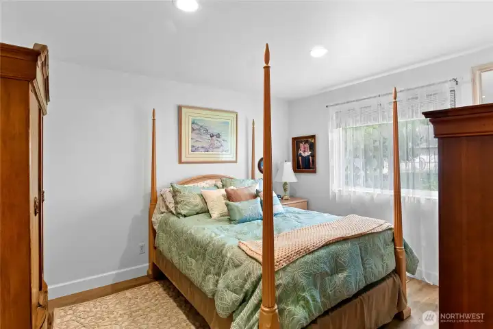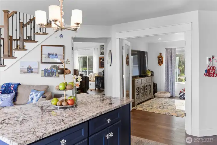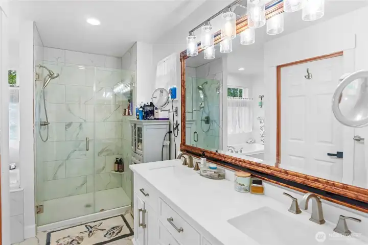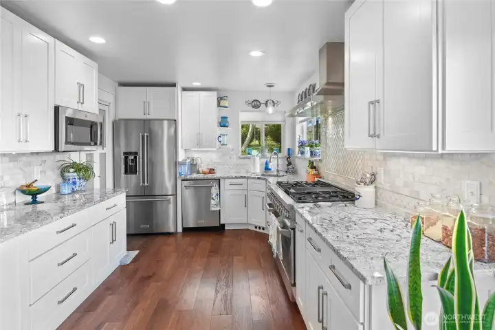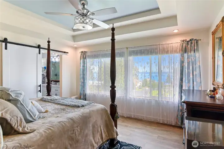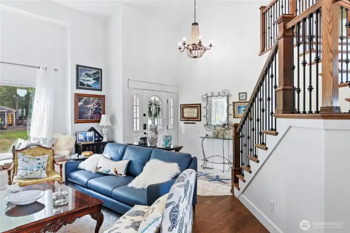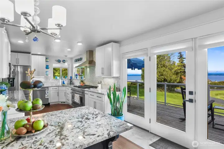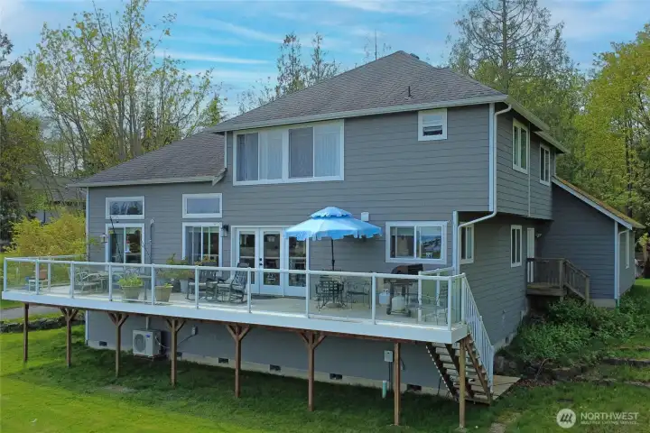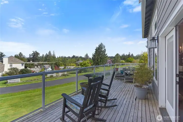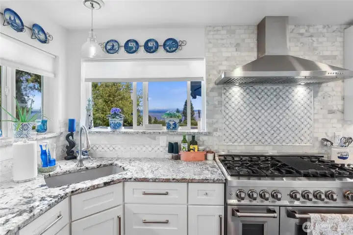 Set on nearly an acre in a gated community, This view-driven property captures sweeping vistas of the shipping lanes and Cascade Mountains. The 3-bedroom, 2.5 bath home is filled with natural light from expansive windows and features a marble foyer, rich hickory plank flooring, and a gas fireplace with custom mantel anchoring the main living space. A formal dining room with chandelier adds a refined touch. All The interior is recently updated -kitchen offers a custom breakfast bar, granite countertops, double ovens, and a professional 48-inch gas range—all positioned to take in the views. The main level also includes a den/office,.5 bath, separate laundry, and access to the 2-car garage with extra storage, a custom wood and wrought iron staircase leads to the primary suite with stunning views, a walk-in closet, and a spacious 5-piece bath Also tasteful use of marble and quartz throughout home. Two additional bedrooms and a full bath complete the upper level. Outdoors, enjoy a paved driveway, 40’ greenbelt buffer, nine fruit trees, raised garden beds, a 12x16 shed. Offering privacy & security-a great place to live.