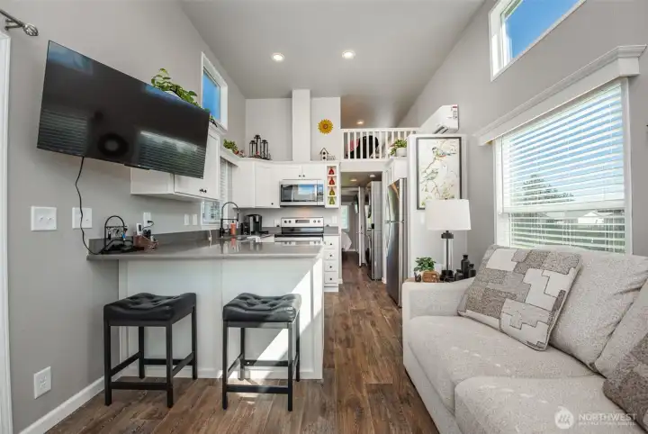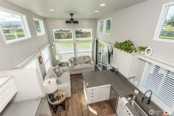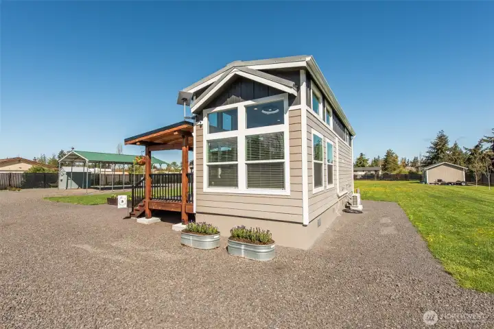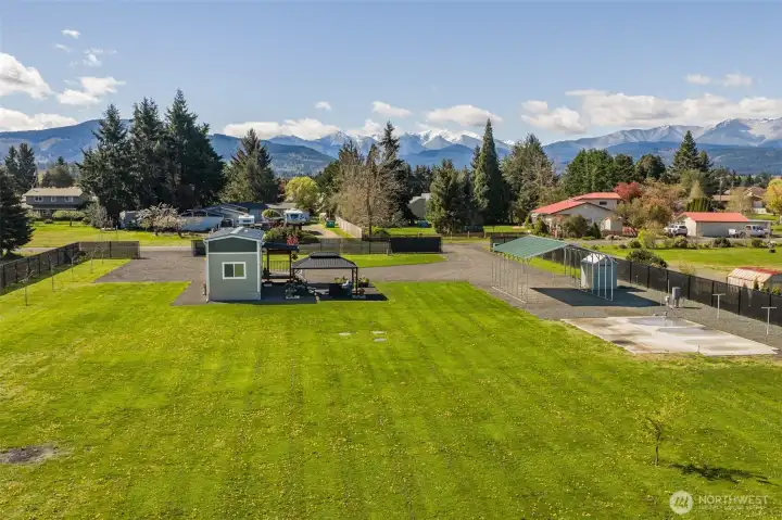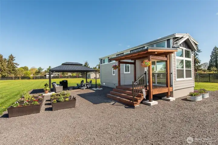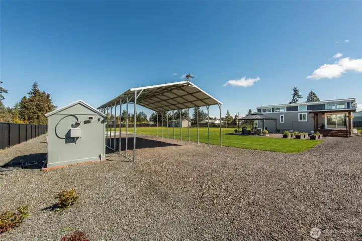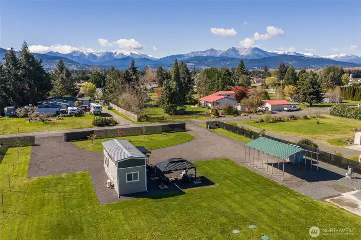 Olympic Peninsula sanctuary in the coveted rain shadow of Sequim! This exceptional property offers views of the majestic Olympic Mountains, setting the scene for your idyllic lifestyle. The heart of this retreat is a sleek, fully permitted park model/tiny home, complete with a custom-built covered deck. It’s perfect for year-round living as is, providing immediate comfort and a turn-key solution. The property's incredible development potential is supported by a pre-installed 3-bedroom septic system, which is ready for the construction of your future dream house. Imagine keeping the tiny home as premium guest quarters or dedicated bonus living space, offering flexibility or rental income. Functionality is key; fully fenced perimeter, a circular driveway accessed by two secure gates, 400 amp power, and being wired for a generator. For RV amenities, a dedicated 24x32 concrete pad and 20x30 metal carport are equipped with full hookups, including 50 amp and 30 amp electric, water, propane, RV dump, plus EV charging. Storage and workspace are abundant with multiple outbuildings, including a large high-quality, stick-built 424 sq ft shop/storage shed. The grounds are a gardener's delight with beautifully established landscaping, featuring raised beds, over 30 fragrant lavender plants, and over 20 fruit and flowering trees. Enjoy outdoor entertaining on the dedicated patio with a gazebo and firepit. You are moments from the renowned Olympic Discovery Trail and ALL Sequim amenities!