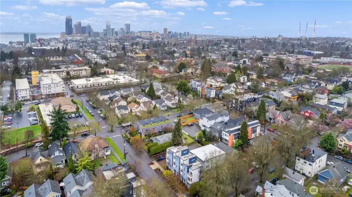 Price Reduction! Stylish in-city living in the heart of the Central District. This rare 2015 end-unit townhome offers nearly 1,400 sq ft on a quiet, tree-lined street. An excellent opportunity for investors or owner-occupants, the versatile layout and prime location offer great short-term rental income potential. Thoughtfully designed with 2 bedrooms, including a flexible lower-level space—perfect for a guest room, office, or den—with access to a private patio. The top-floor primary suite features a spacious en suite bath, creating a comfortable retreat. The open-concept main level provides generous living and dining space, complemented by a powder room and oversized windows that bring in abundant natural light. Enjoy city and Mount Rainier views, along with fresh interior paint for a clean, move-in ready feel. Additional highlights include an attached garage, ample street parking, and a private rooftop deck with gas hookup—ideal for entertaining. Walk Score of 90 offers easy access to shops, dining, and parks.