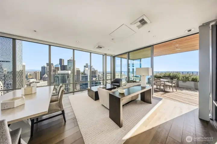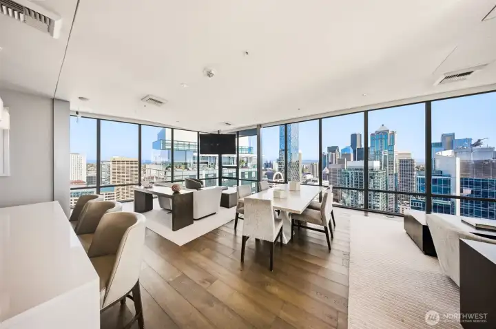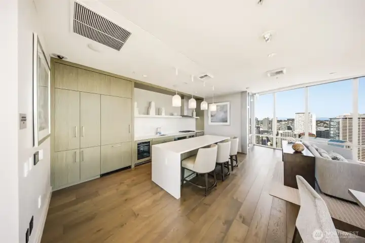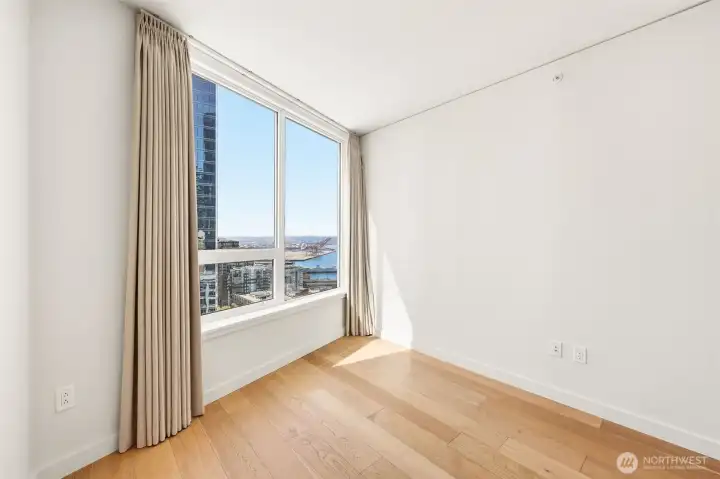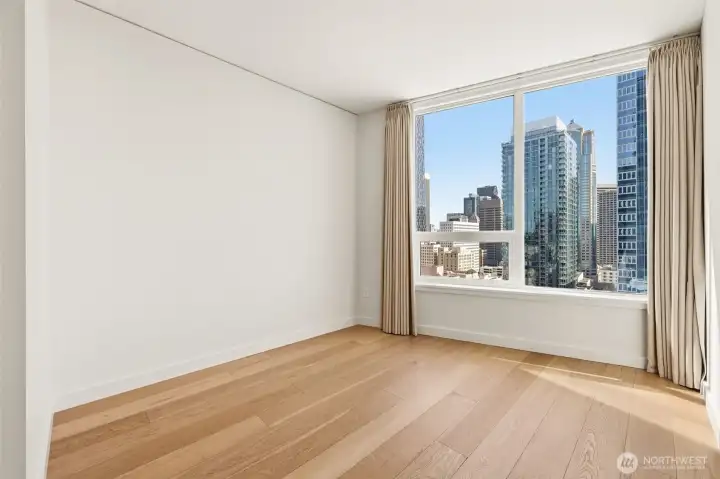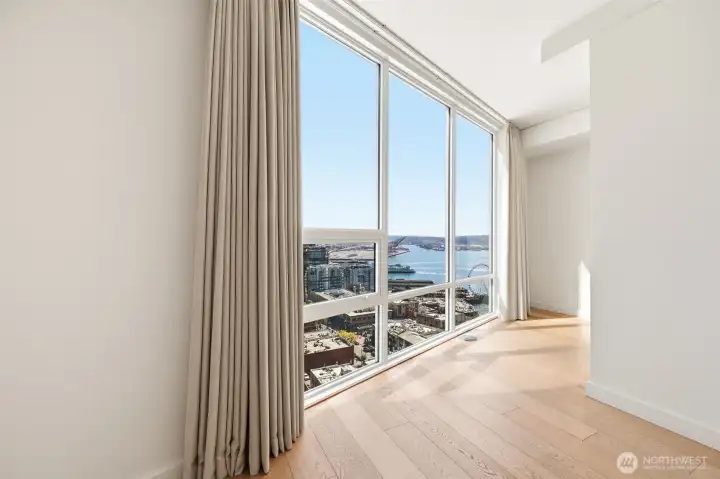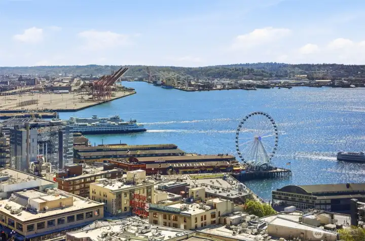 Perched high up on the 18th floor with an incredible vantage point of Seattle's world-famous landmarks, experience the true essence of downtown living. Reside to your living room and be greeted by an unparalleled cityscape, featuring expansive views of the best Seattle has to offer. Pike Place Market, The Great Wheel, and Elliott Bay are all on grand display right from home, and simply a block away to visit in-person. Built in 2021 with modern finishes around every corner, this space has everything you could want for thoughtful urban living - main bedroom sharing the same coveted view, spacious kitchen with gas stove + Bosch appliances + quartz counters + soft-close modern cabinets, and a private office space for the moments you need to slow down from the city bustle. Convenience shines, as resident amenities include 24/7 concierge, fitness/gym, dog play area + dog wash, top floor community lounge with WiFi + event kitchen, rooftop patio, indoor/outdoor entertaining space, and so much more. The monthly HOA dues include so many items ensuring comfortable living - central hot water, garbage service, sewer, natural gas, common area maintenance, concierge, earthquake insurance, security services, gated/secure access, and all building amenities. They say the most important thing in where you live is location, location, location. Well, located just a few steps away from the waterfront, groceries, restaurants, coffee, shopping, and more, one thing is clear - you've found your home.