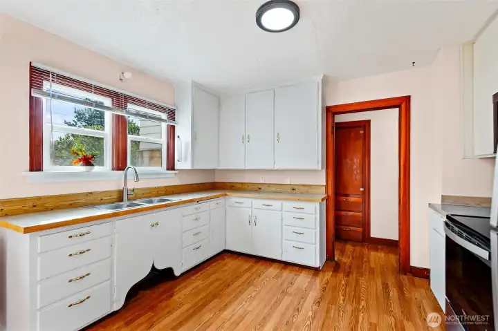 Meticulously kept 1940s home in the heart of Ellensburg! First time on the market in over 30 years, this corner lot property offers exceptional potential. Situated on a large city lot with alley access and detached garage, it provides flexibility for future improvements such as an ADU or larger garage. The detached garage has a 40s style canned fruit cellar and a closet- perfect for additional storage. The garden space is ready for your personal touch. The home features an updated bathroom, updated kitchen counters and sink, new stainless steel appliances, and fresh interior paint. The well-maintained interior reflects pride of ownership throughout. Original 1940s trim and interior doors add timeless character, while the living room, dining room, and primary bedroom showcase original hardwood floors. The exterior was painted in 2023, and the home includes a newer hot water tank for added peace of mind. Ideal for investors or those searching for the perfect starter home, this property is conveniently located near downtown Ellensburg and Central Washington University, offering easy access to local amenities. Close proximity to local schools adds everyday convenience.