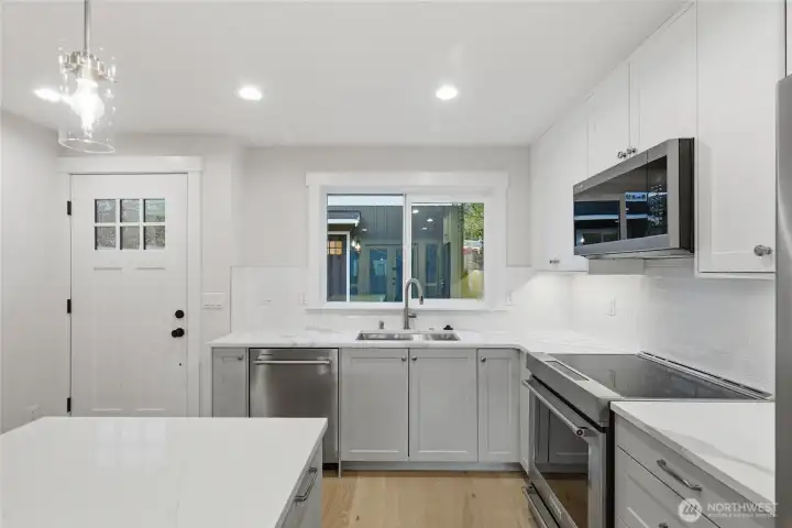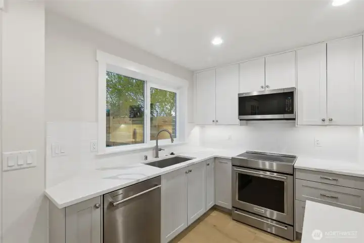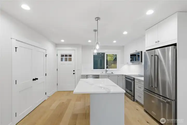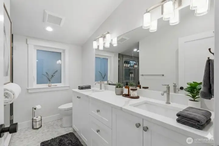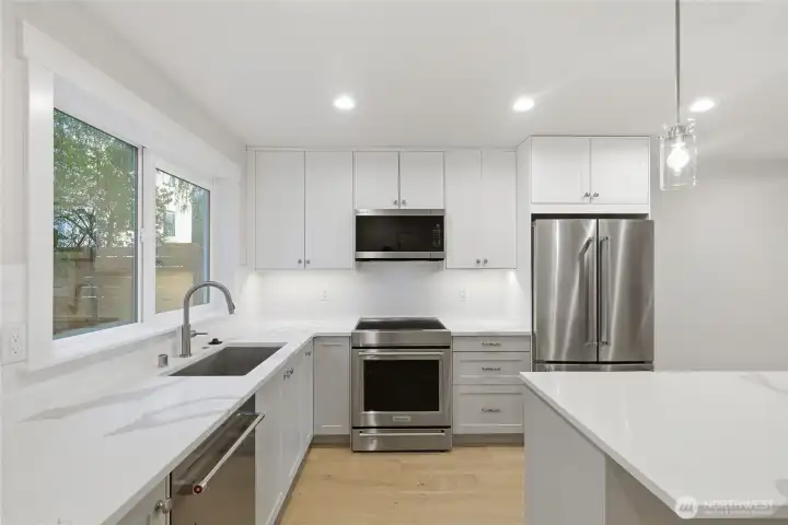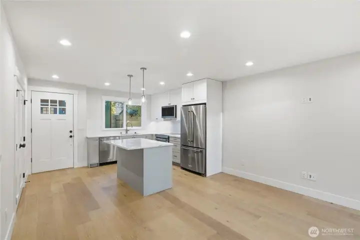 Crisp modern design meets everyday comfort. Two story detached home from Seattle favorite boutique builder Garton Developments on one of the finest tree-lined streets in North Green Lake. Thoughtfully designed new construction, these home blends modern craftsmanship with timeless finishes. Wide-plank hardwoods, clean-lined shaker doors, and black hardware create a cohesive, elegant look, while a custom entry drop zone adds practical style. The kitchen features two-tone Bellmont cabinetry, quartz counters, full-height backsplash, and a spacious peninsula with pendant lighting. Bathrooms showcase designer tile, quartz, and modern fixtures, including a spa-like primary suite bath and a boutique powder room. Additional highlights include plush carpeted bedrooms, black spindle stair railings, curated exterior lighting, and a neutral palette for a bright, calm feel. Don't miss the heated garage/flex room, a rare find for in-city new construction. Set on a quiet, peaceful street yet just moments from vibrant conveniences including Green Lake, Northgate Station, North Seattle College and much more!