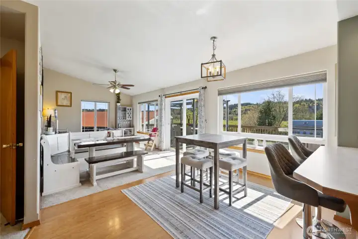 Versatile dining nook and at-counter eating spaces that overlook the deck and pasture.