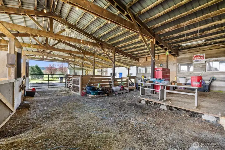 4,800 SF Barn offers a shop, livestock stall and staging gates, covered parking and storage.