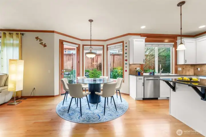 Chef's kitchen with a picture window, ample amount of quality cabinets, full backsplash, new stainless steel appliances, granite countertops, and island extends to a sun filled breakfast nook which opens to a sizable patio in fully fenced backyard with mature landscaping - a perfect place to relax and entertain