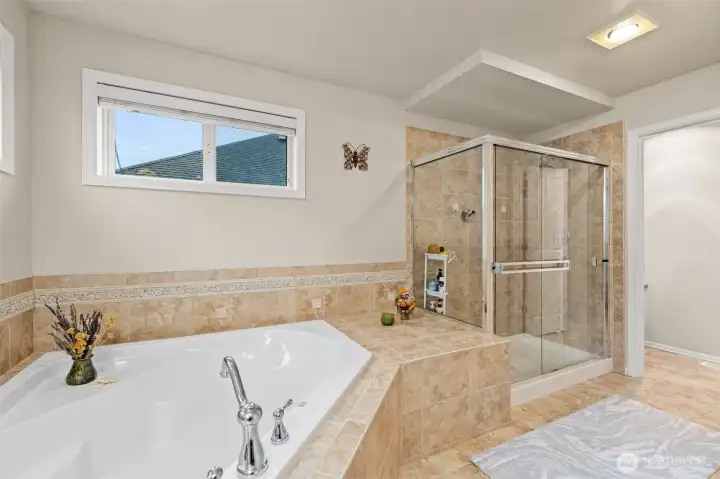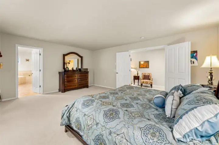 A sumptuous primary bedroom with a spa-style 5-piece primary bathroom and a huge walk-in closet