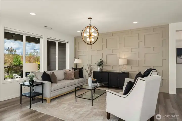 The spacious great room with the stunning feature wall, high-end lighting (throughout)and generous windows overlooking the beautiful and private outdoor space.