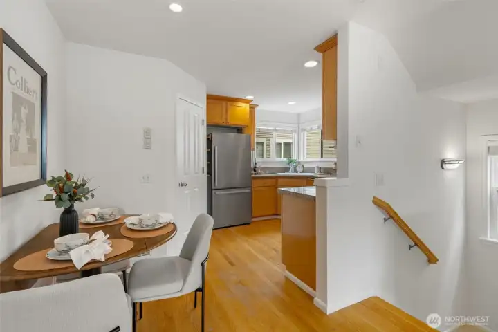 Open light filled kitchen with SS appliances.