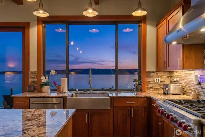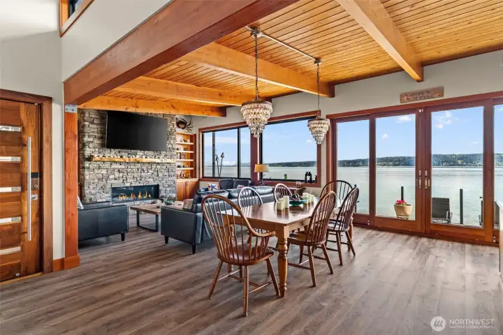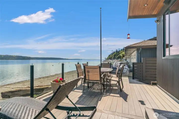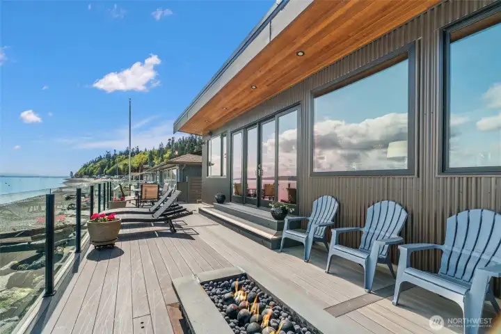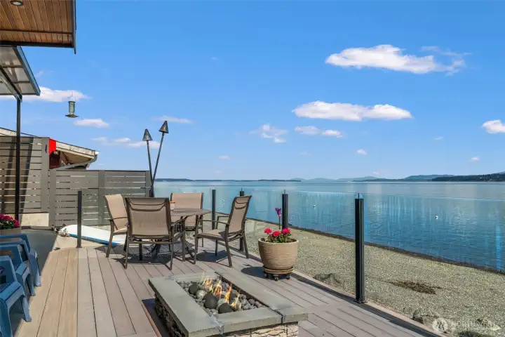 Twilight views set the stage from this expansive no-bank waterfront deck, complete with glass railing, fire feature, and seamless access to the shoreline—perfect for relaxing, entertaining, and enjoying Camano Island’s peaceful coastal setting.
