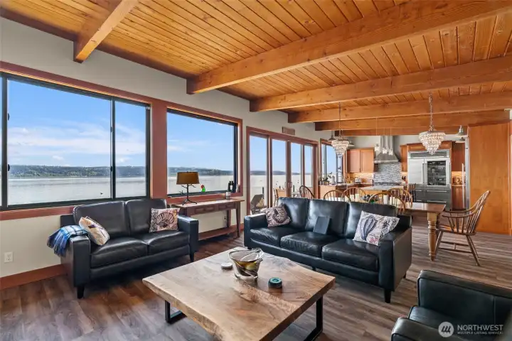 Great room with custom fireplace and floor to ceiling windows to allow the views in.