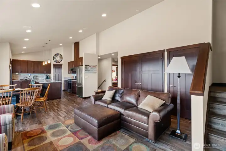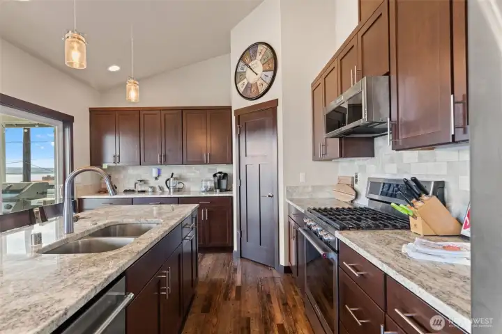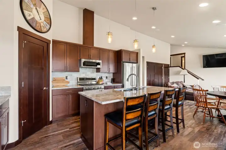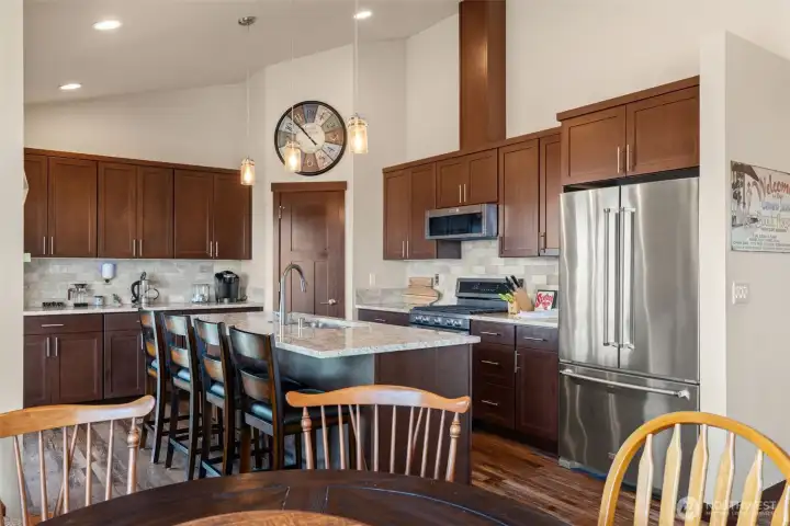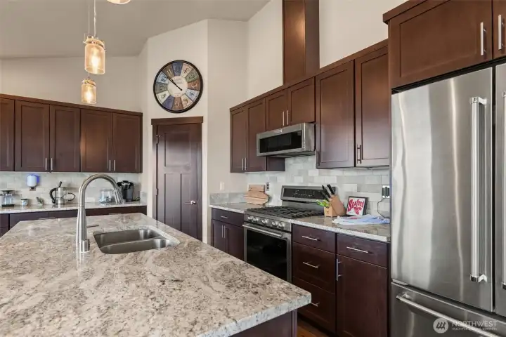 Kitchen with center island, stainless appliances, granite counters, walk-in pantry.