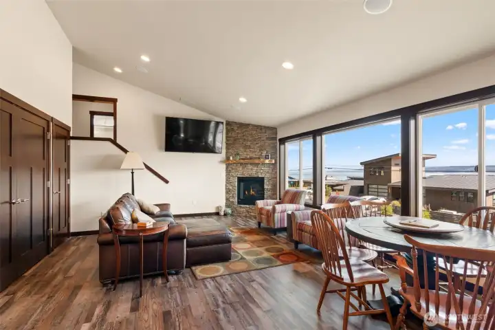 Open living room with fireplace.