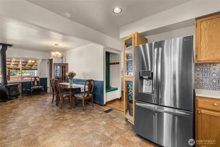 Kitchen w/ abundant natural light opens to dining area with wood stove