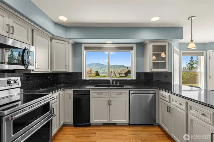 Private retreat! Mature and maintenance free landscaping RV parking, room for basket ball, volley ball and hopscotch! Grand entry with soaring ceilings and gorgeous hardwood floors. Den/Library to tuck away in for privacy. Remodeled kitchen with adjacent family room Snuggle up to the warm flames while watching the rain gently falling. Or leave that room to the troops and rest in formal living room with warm glows of cozy fireplace and a good book. Primary suite is truly a suite, with large jacuzzi tub in the bath area, and sliders to walk out, sit and enjoy your morning coffee, gazing at the ever changing mountain and river scenery. Guest bedroom has view of river and shares a Jack and Jill closet with 3rd bedroom. Oversized 3 car garage You will get a good view of the fireworks!!