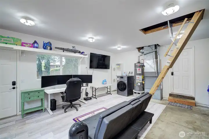 Finished garage offers multiple use options for parking, office, gaming or play space!