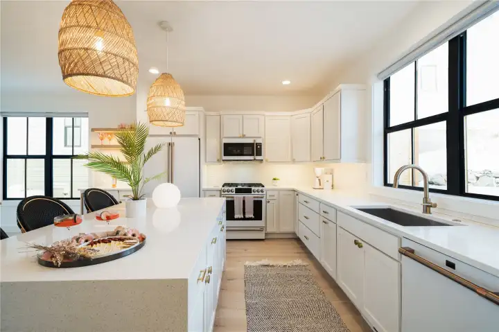 Waterfall edge, quartz countertops
