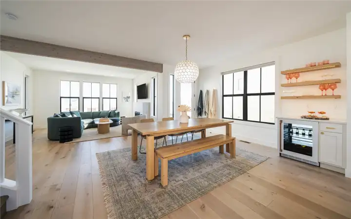 Beverage bar, open shelving, accent lighting, backlit bevy fridge and a quartz counter top.