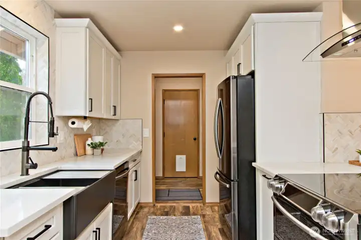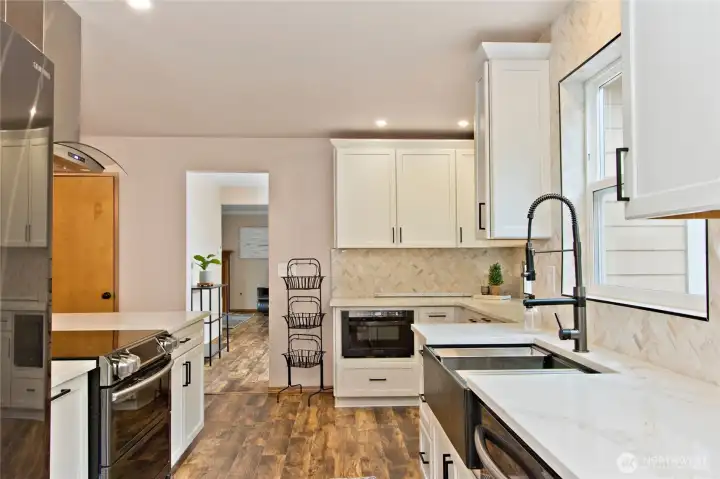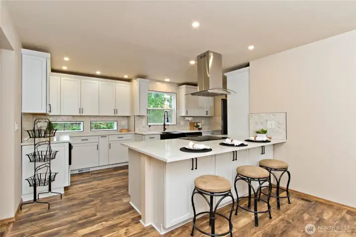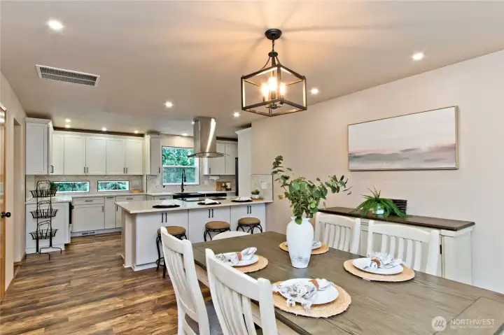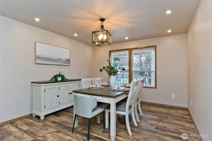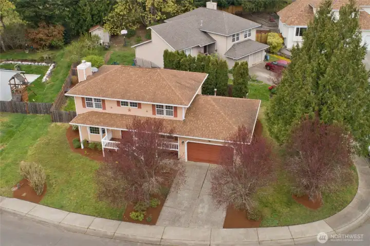 Farmhouse-style home with a welcoming covered front porch, set on a spacious corner lot connected to a cul-de-sac in the Tall Timbers community! Updated throughout with new laminate wood flooring, interior paint, leaf guard gutters, LED lighting, and custom dimmable zones in the living, dining, and kitchen areas. Remodeled and expanded kitchen features quartz countertops, an extra-large peninsula, added cabinetry plus a beverage/bar area with fridge. Main floor half bath updated with new fixtures. Four bedrooms upstairs, along with ample storage throughout the home and garage. Enjoy covered porches in both the front and back and established landscaping. Conveniently located near shopping, dining, and commuter routes.
