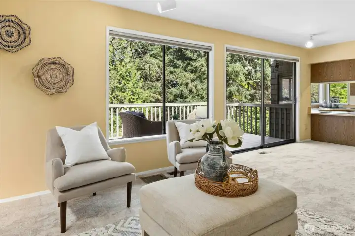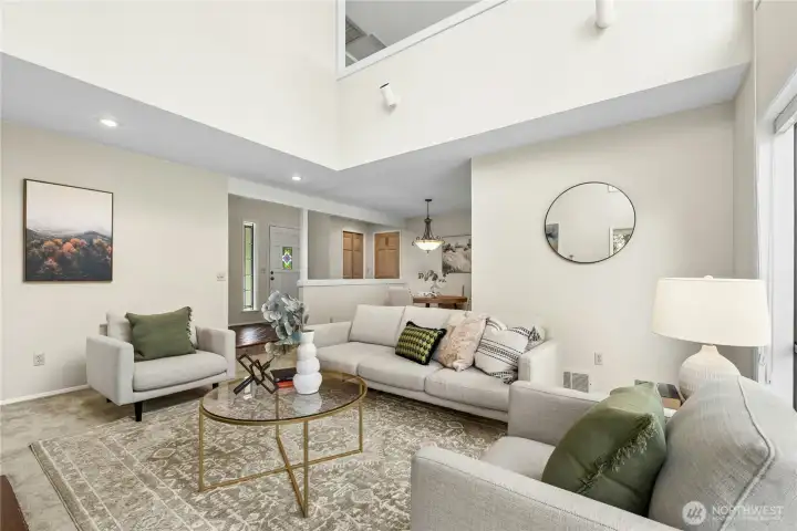The gracious living room has soaring ceilings and floor to ceiling west-facing windows.