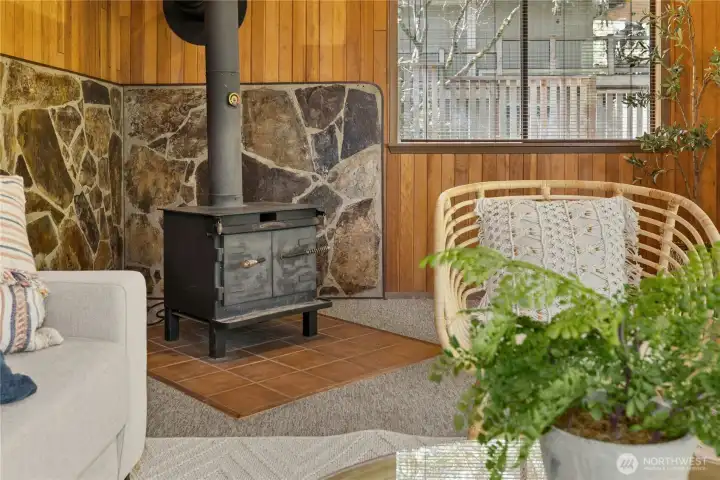 On the lower level there is a flexible rec room with wood stove and slider out to the backyard.