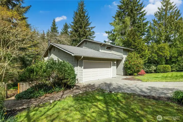 The fenced backyard has a lawn framed by mature shrubs and evergreens.