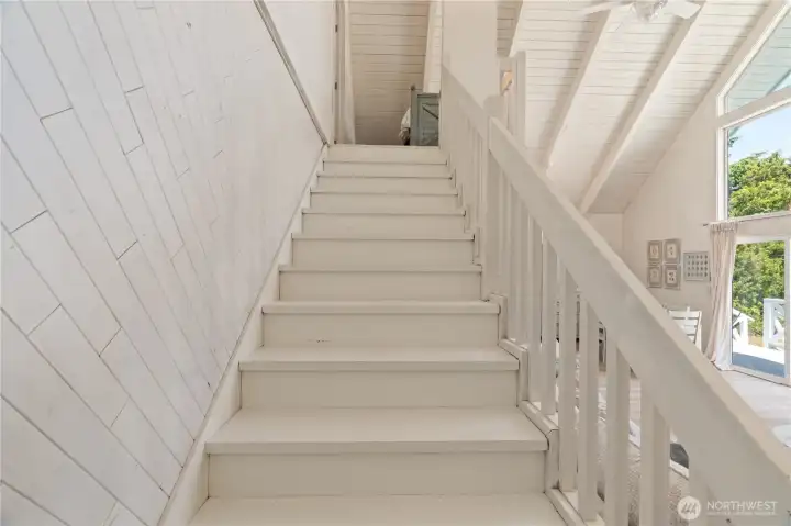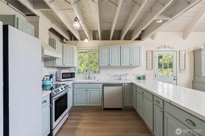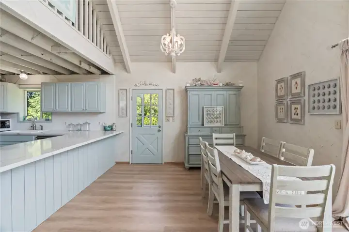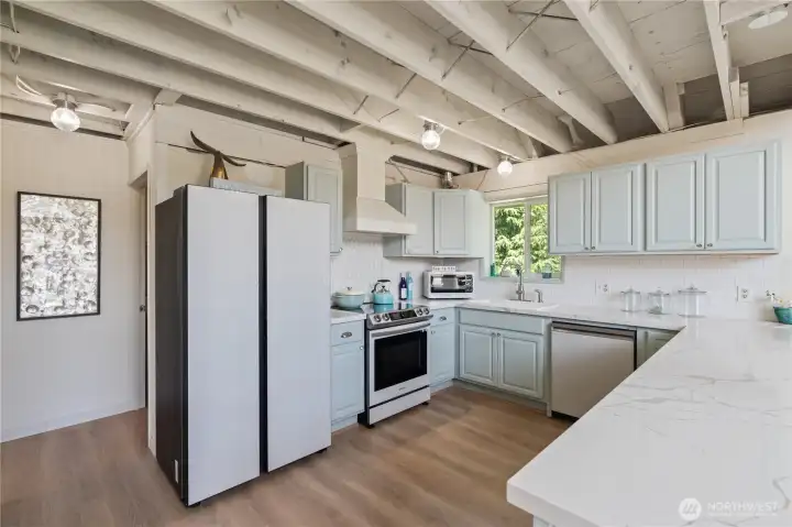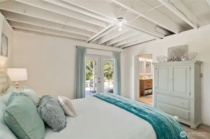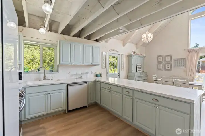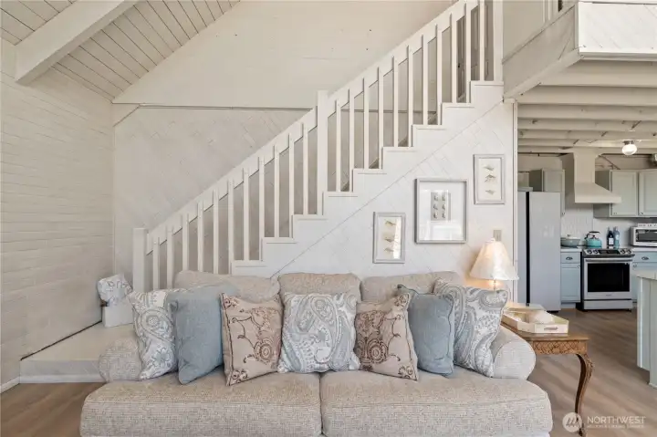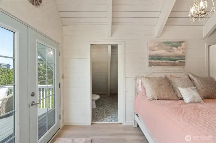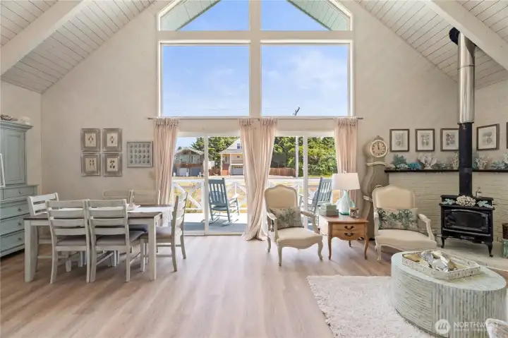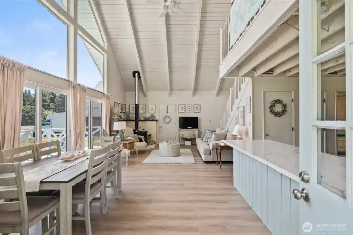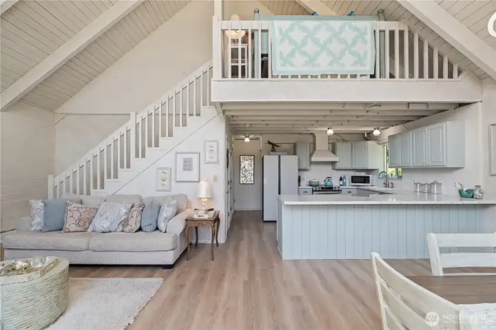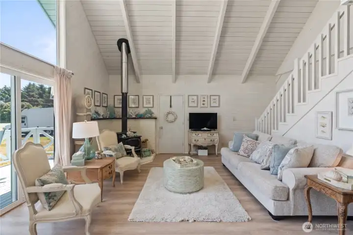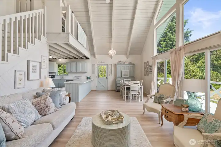 This fully renovated chalet-style beach cottage offers two luxurious primary en-suites and an inviting blend of coastal charm and modern design. Showcasing beautifully painted woodwork, exposed beams, and soaring ceilings, the open-concept living and dining areas are bathed in natural light from floor-to-ceiling windows. The brand-new chef’s kitchen features high-end Samsung Café appliances, a custom range hood, new cabinetry, designer tile backsplash, and sleek quartz countertops—perfect for entertaining or quiet mornings at the beach. Upstairs, a serene vaulted-ceiling suite boasts a spa-inspired ensuite bathroom with a soaking tub, a spacious walk-in closet, and French doors opening to a new west-facing deck. The loft provides additional flexible living space—ideal for an office, lounge, or guest area. The main-level suite offers double closets, a stylish ensuite bath with dual vanities, and French doors that lead to a newly paved patio with a seating area and firepit. A large laundry room with a half bath completes the main level. Enjoy expansive outdoor living and timeless coastal elegance in this thoughtfully reimagined beach retreat. Owners have access to O.S. Community Club amenities, RV parking.