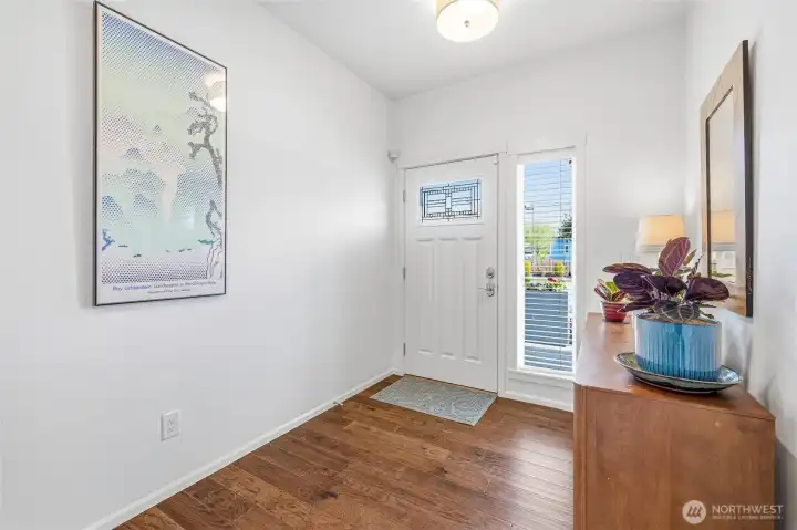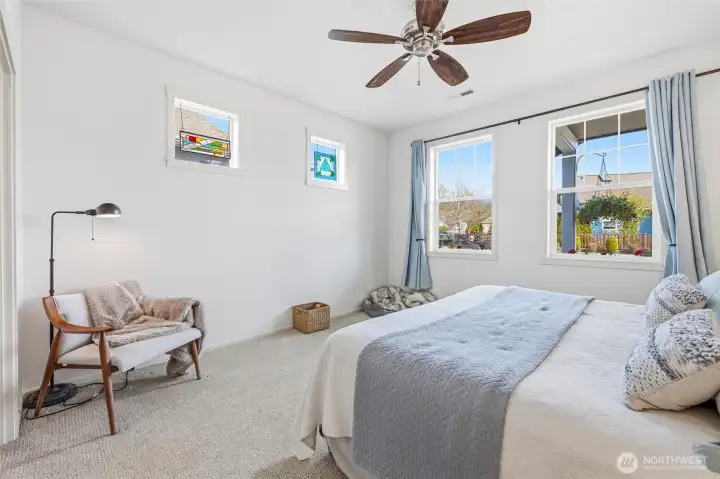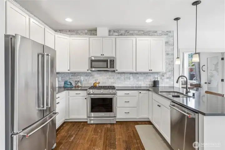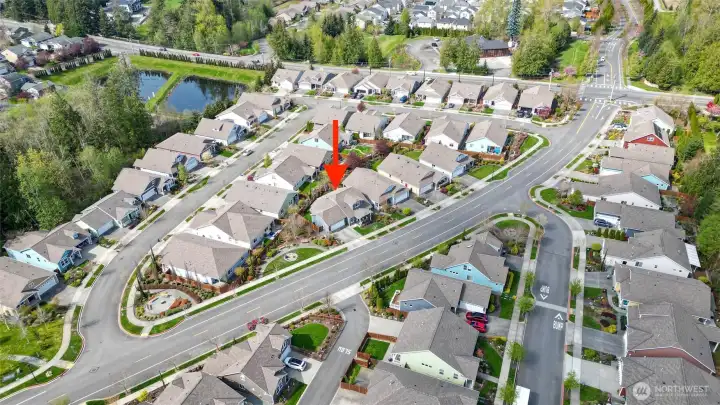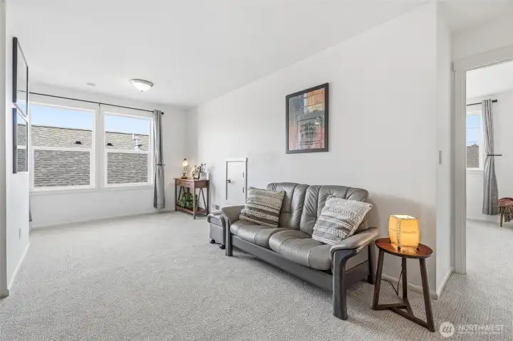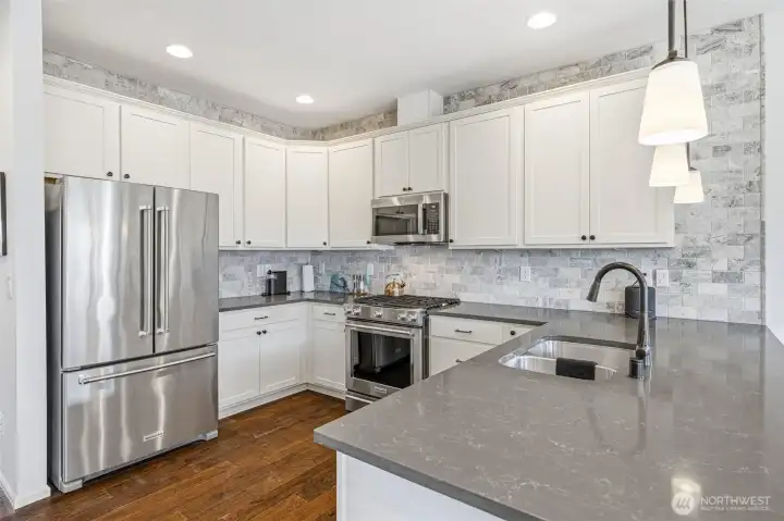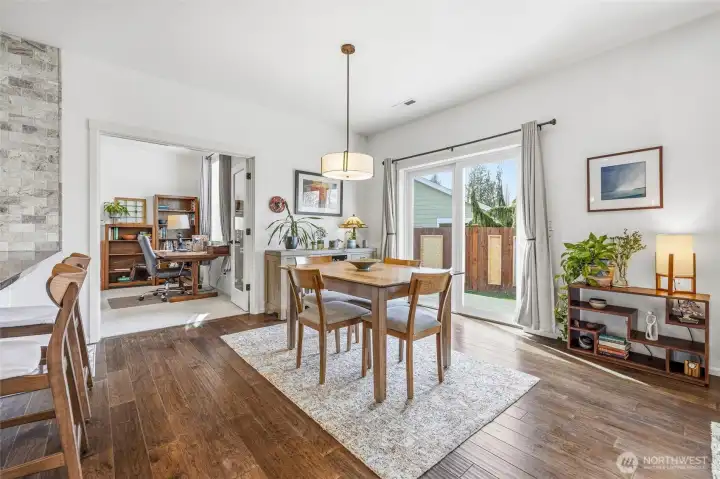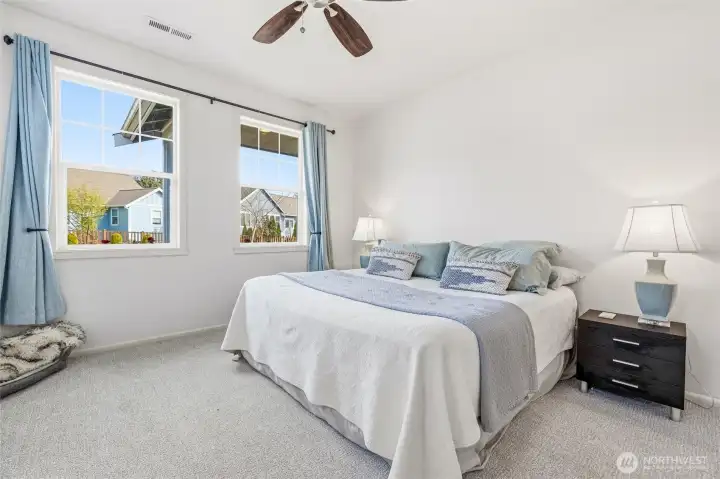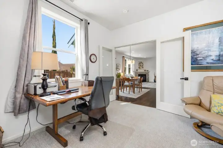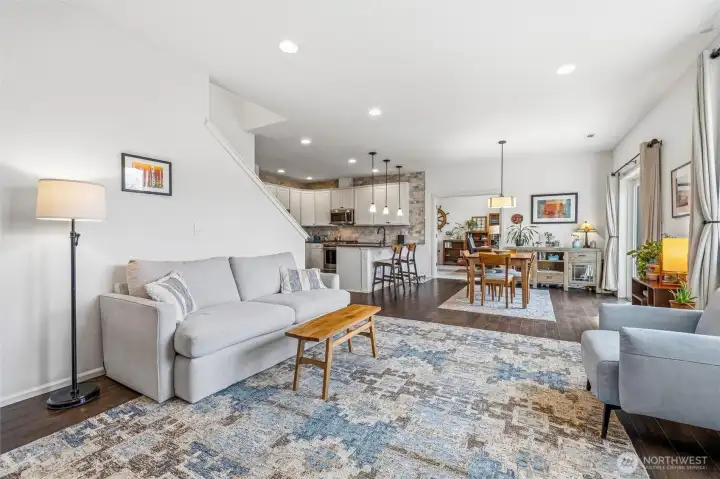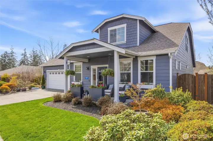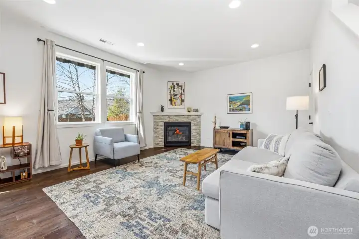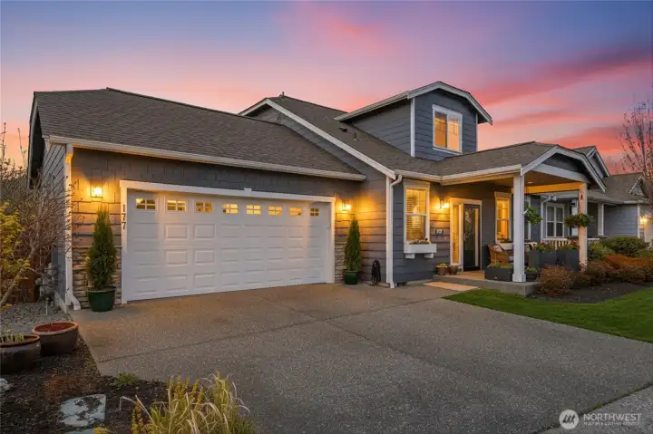 Welcome to this move-in-ready home with main-level living in Woodside, a vibrant and active 55+ community. Entering into the inviting foyer there's a powder room, coat storage, dedicated laundry room and a wide hallway leading to the open concept kitchen, living, and dining rooms. The well-equipped kitchen features stainless appliances, quartz countertops, abundant high-quality cabinetry and an upgraded full-height stone backsplash that adds depth and texture to the welcoming space. The spacious living room features a gas fireplace and large windows overlooking your private fenced backyard and patio. Also on the main floor you'll find the large primary en-suite bedroom with walk in closet and well-appointed bathroom featuring dual vanities and extra storage, as well as an additional bedroom/office/den through the french doors off the dining room. Upstairs is an additional bedroom, bathroom, and comfortable family/great room for extra space to spread out. With hardwood floors in common areas and high-quality carpet in the bedrooms and upstairs, new paint inside, wood-wrapped windows and many upgrades throughout, this home is ready for its next owner to move right in. The large 2-car garage has extra room for storage or a workshop area and the fully fenced backyard has an expanded concrete patio with multiple places for dining, seating, or entertaining. Situated next to a manicured community park with easy access to shopping, medical facilities, walking trails, and more!