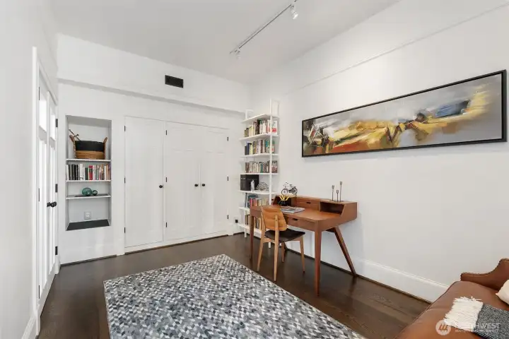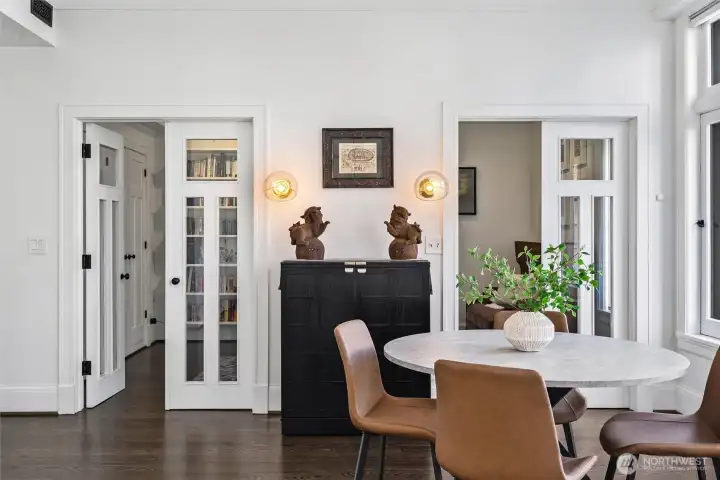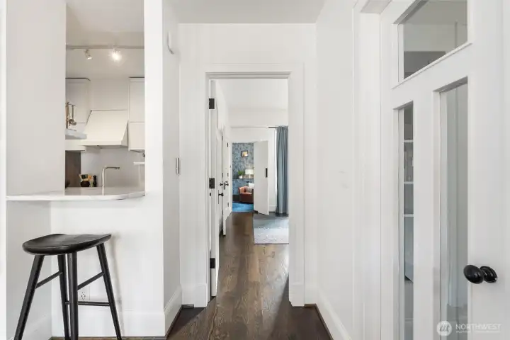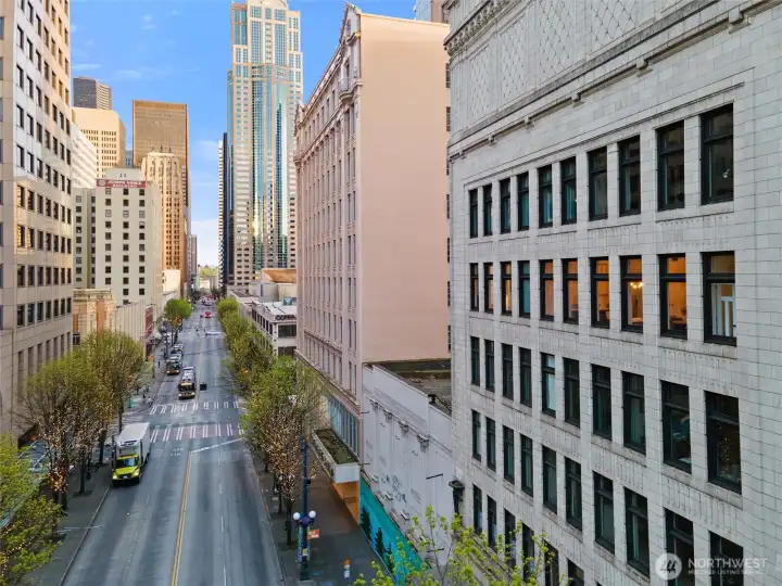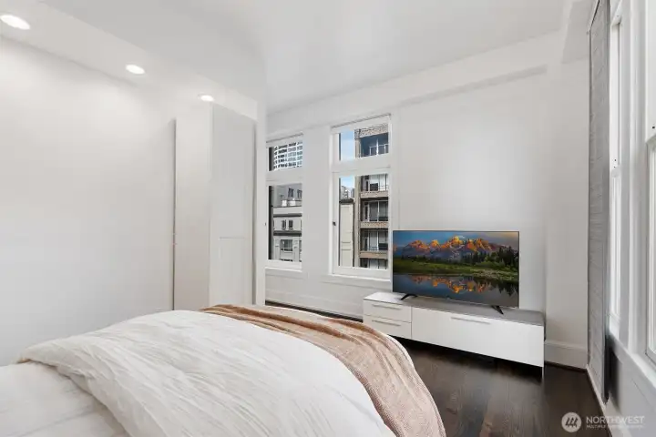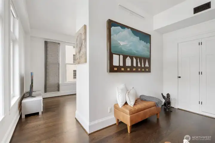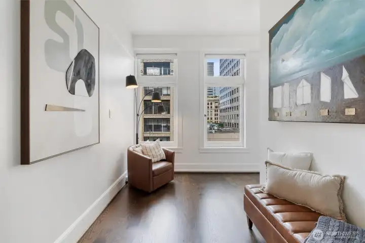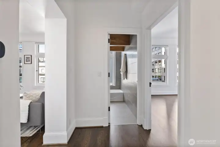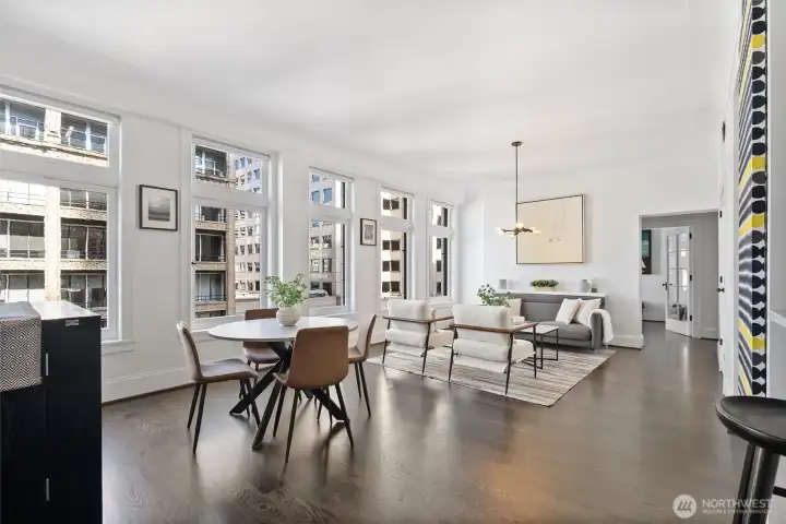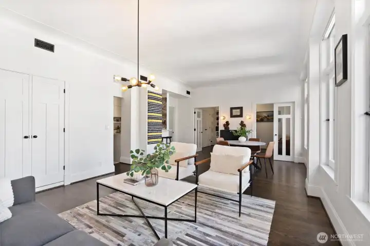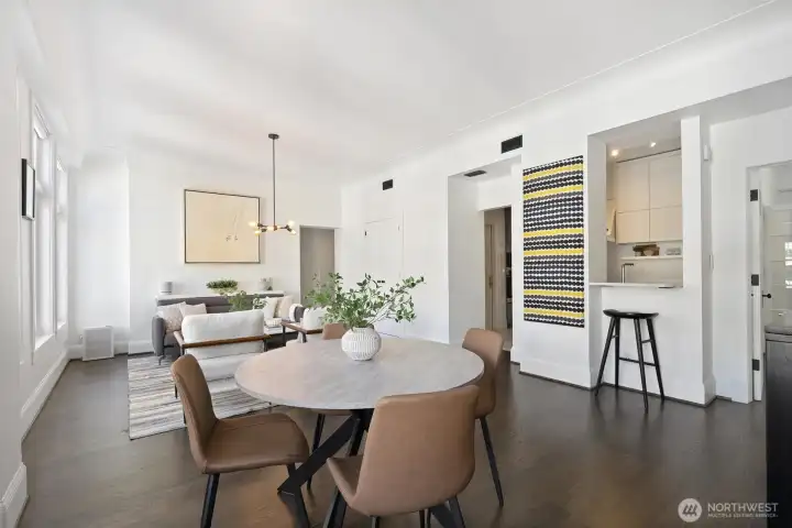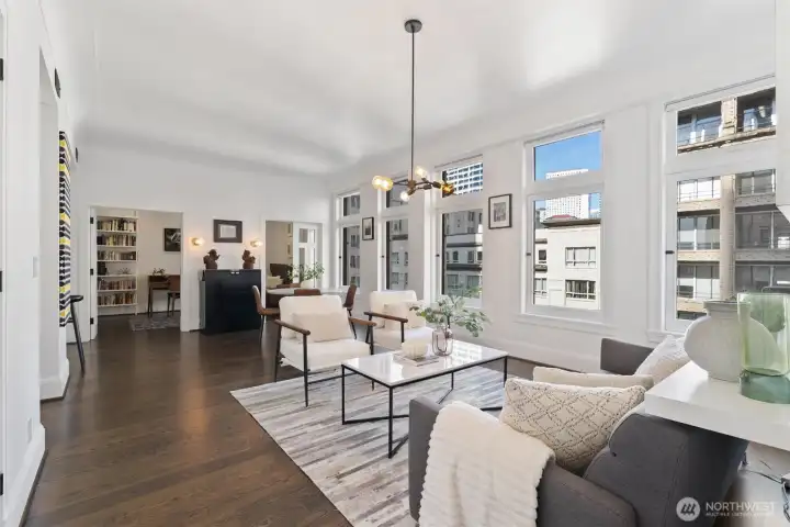 Beautifully updated 3-bedroom, 1.75-bath condo in a historic downtown Seattle building just one block from Pike Place Market. This 1,377 sq. ft. home blends timeless character with modern style and feels like an elegant apartment in Europe. Soaring ceilings, oversized windows, and rich walnut hardwood floors create a warm, light-filled feel. The spacious living and dining areas flow into a designer kitchen with marble counters, sleek cabinetry, premium appliances, and a stunning vintage Seattle map mural. The flexible floor plan includes three spacious bedrooms, beautifully updated baths, and two separate entrances—allowing the condo to easily be divided into two apartments. Perfect for multigenerational living, rental income, or adding a smart investment property to your portfolio for the price of one. Unbeatable location near the waterfront, shopping, dining, entertainment, and all the excitement of downtown Seattle—including the upcoming FIFA World Cup 2026.