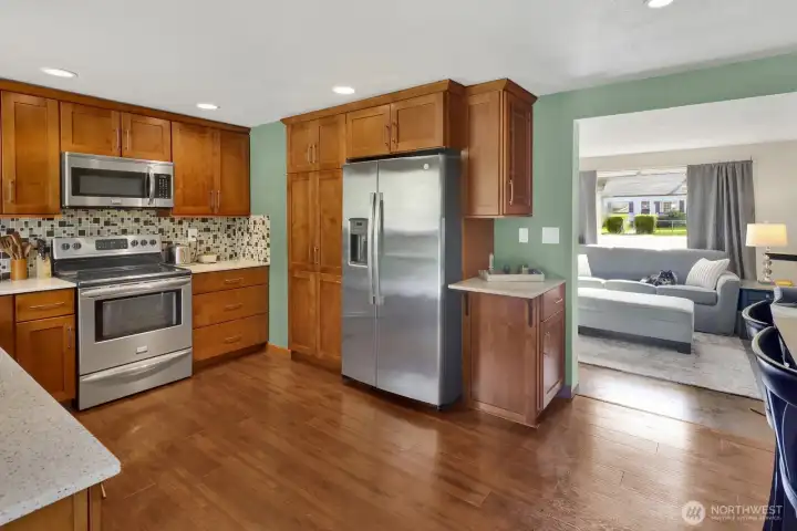 Shaker cabinets and stainless steelappliances.