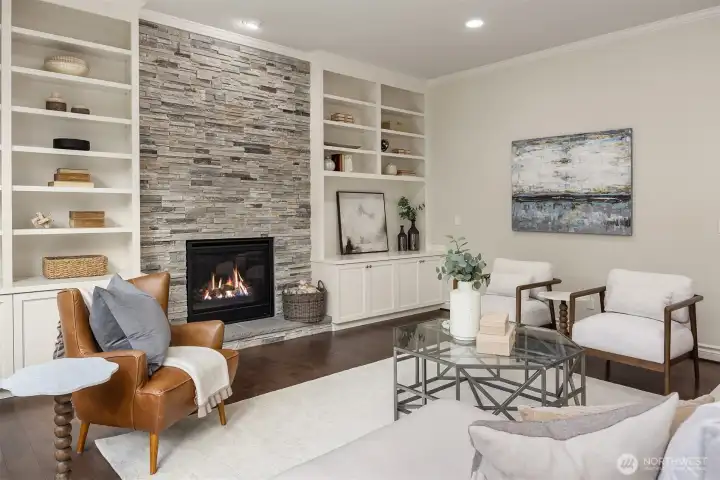 Refined and inviting, this elegant family room is anchored by a striking floor-to-ceiling stone gas fireplace and complemented by bespoke built-in cabinetry. Expansive windows frame serene natural surroundings, while wide-plank hardwood floors add warmth and timeless sophistication.