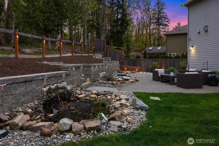 A private, fully fenced outdoor retreat features an expansive patio ideal for entertaining. Manicured, professional landscaping with triple Koi ponds and water features create a feeling of Zen with nature.