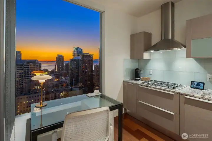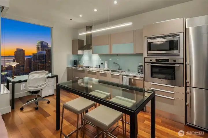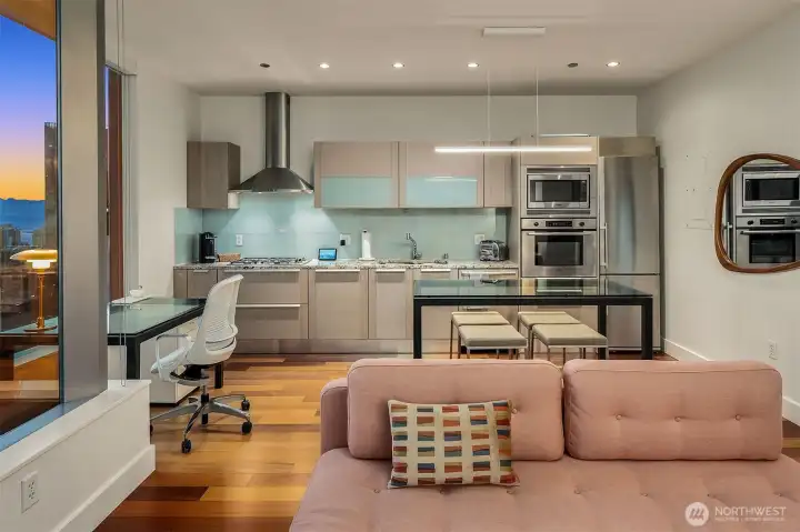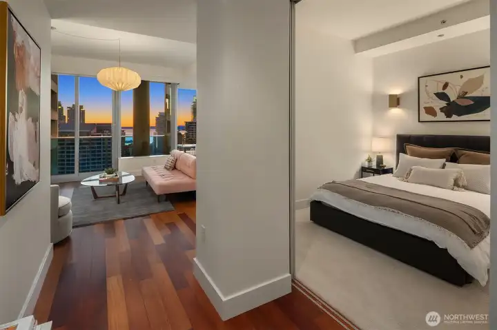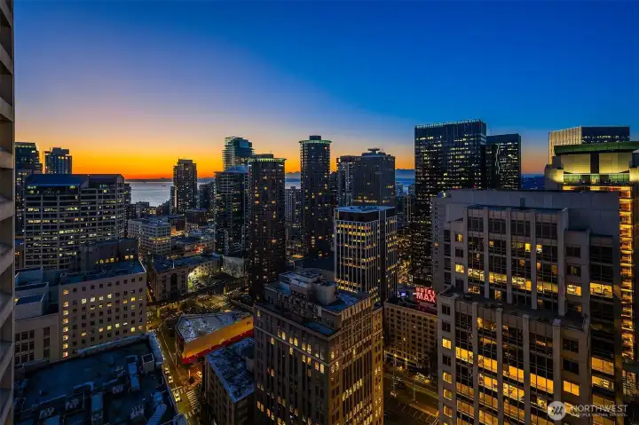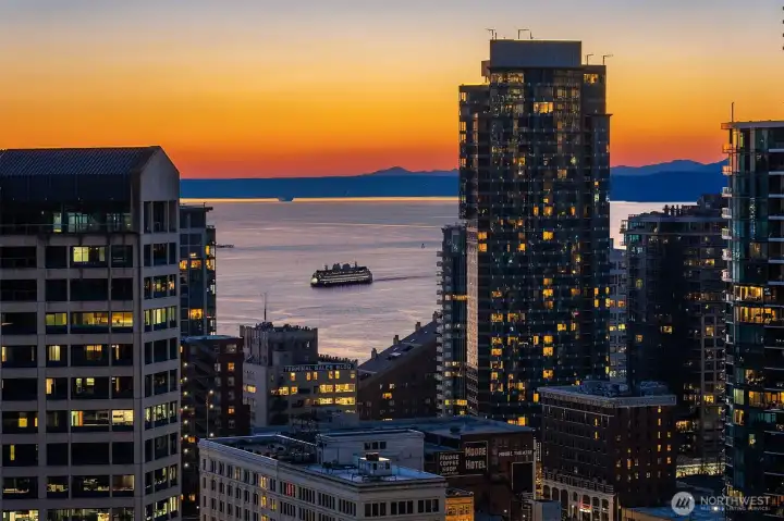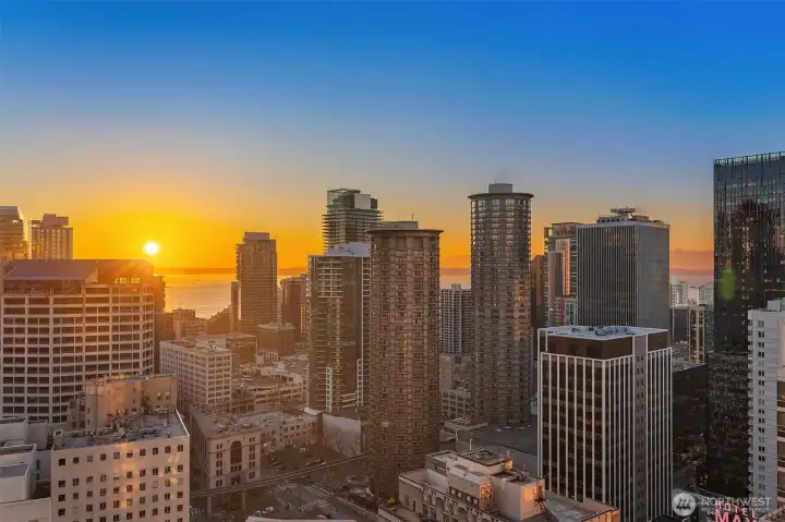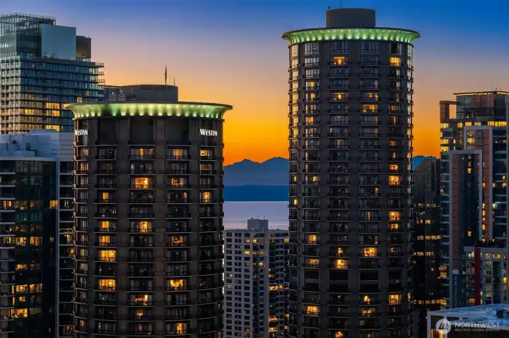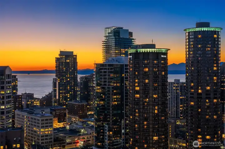 Experience elevated city living at Olive 8, where modern luxury and unbeatable convenience converge in the vibrant heart of downtown Seattle. This beautifully appointed 1-bedroom, 1-bath residence showcases sweeping west-facing views of the Puget Sound, glowing sunsets, and the dynamic city skyline—creating a stunning backdrop from day to night. Thoughtfully designed with comfort and style in mind, the home includes a highly sought-after parking space and dedicated storage unit. Residents enjoy access to an exceptional suite of amenities, including 24/7 concierge service, a state-of-the-art fitness center, yoga studio, game room, pet retreat, and an elegant party lounge—perfect for entertaining. For those seeking a resort-style experience, optional hotel membership provides access to the Hyatt’s luxurious pool, hot tub, and sauna. Ideally located just steps from Pacific Place, Amazon, Whole Foods, and world-class dining destinations like Din Tai Fung, this home offers the ultimate in walkable urban living. Whether you're enjoying a quiet evening with sunset views or stepping out to explore the best of Seattle, Olive 8 delivers a lifestyle of sophistication, ease, and connection.