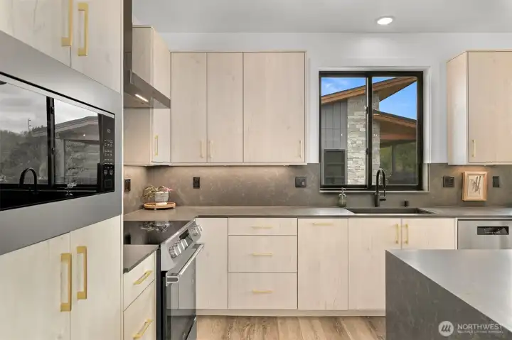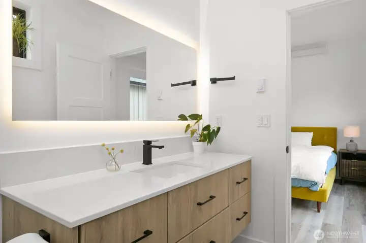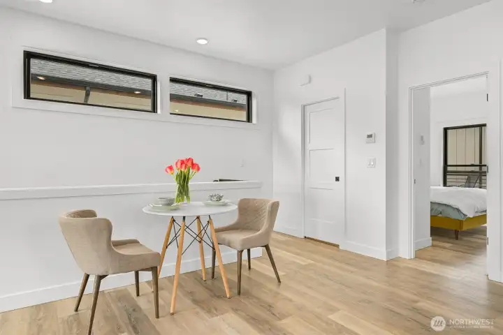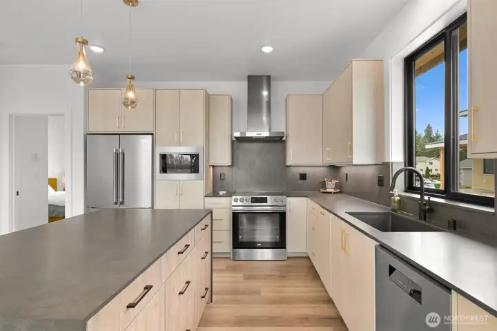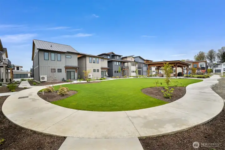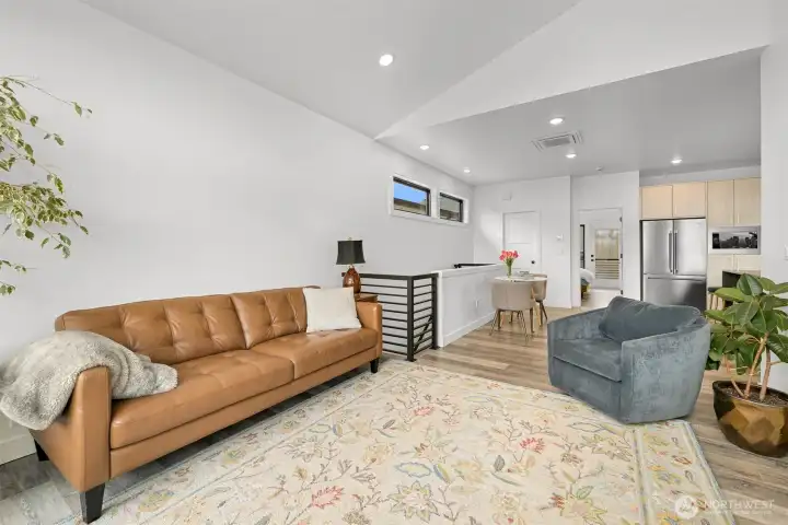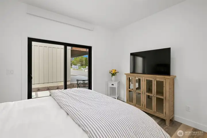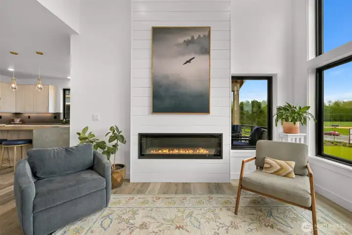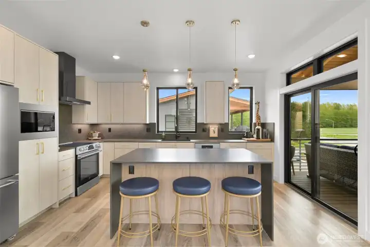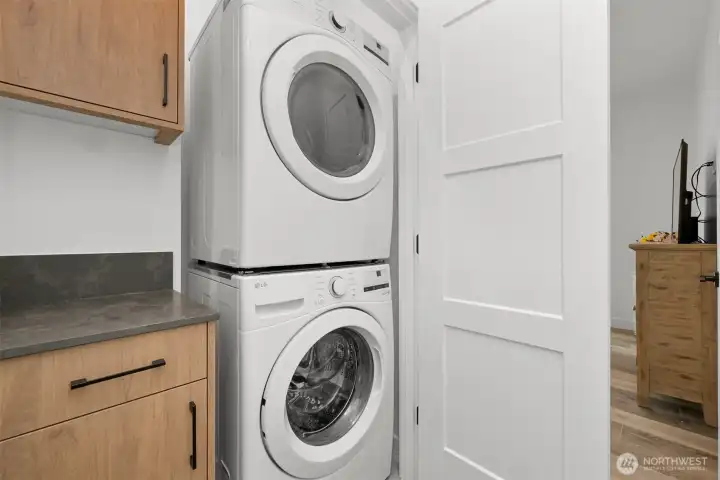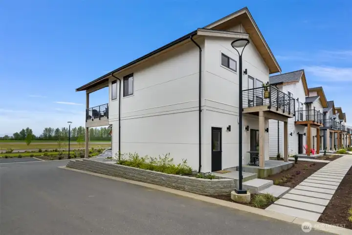 Discover River-Walk, a thoughtfully designed NW Washington community known for its upscale finishes, scenic surroundings, low maintenance living, and walkable connection to charming downtown Lynden. Enjoy easy access to local restaurants, boutique shops, and everyday conveniences, all just a short stroll or bike ride away. Situated on the desirable east side, this modern style home offers 1,428 sq. ft. of comfortable living with numerous upgrades throughout. Upstairs you'll find the primary suite with its own laundry, and beautiful living space flooded with natural light. The gourmet kitchen shines with quartz countertops, custom cabinetry, stainless steel appliances, and an expansive waterfall island, perfect for both everyday living and entertaining. The main level features the second bedroom and bathroom with a second laundry, and a bonus space with kitchenette, providing opportunities for multigenerational living or a great home office set up! Take in the beautiful view from the upper balcony deck, unobstructed and preserved by the green space in front of the home. Truly turn-key for anyone seeking the perfect blend of modern, upscale amenities with the slow pace of small town living.