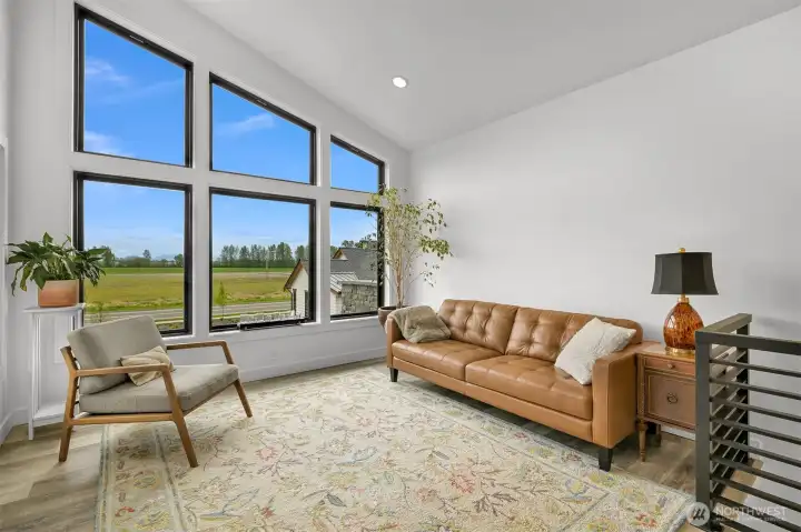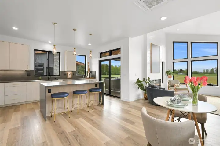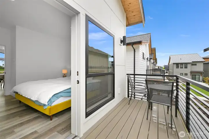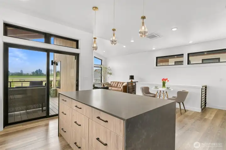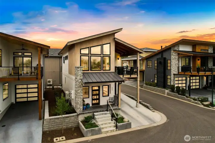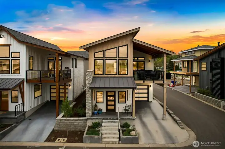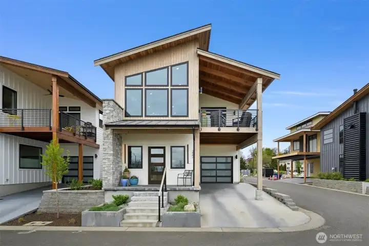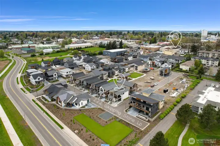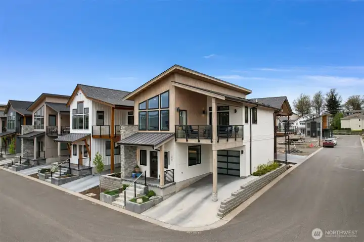 Discover River-Walk, a thoughtfully designed NW Washington community known for its upscale finishes, scenic surroundings, low maintenance living, and walkable connection to charming downtown Lynden. Enjoy easy access to local restaurants, boutique shops, and everyday conveniences, all just a short stroll or bike ride away. Situated on the desirable east side, this modern style home offers 1,428 sq. ft. of comfortable living with numerous upgrades throughout. Upstairs you'll find the primary suite with its own laundry, and beautiful living space flooded with natural light. The gourmet kitchen shines with quartz countertops, custom cabinetry, stainless steel appliances, and an expansive waterfall island, perfect for both everyday living and entertaining. The main level features the second bedroom and bathroom with a second laundry, and a bonus space with kitchenette, providing opportunities for multigenerational living or a great home office set up! Take in the beautiful view from the upper balcony deck, unobstructed and preserved by the green space in front of the home. Truly turn-key for anyone seeking the perfect blend of modern, upscale amenities with the slow pace of small town living.