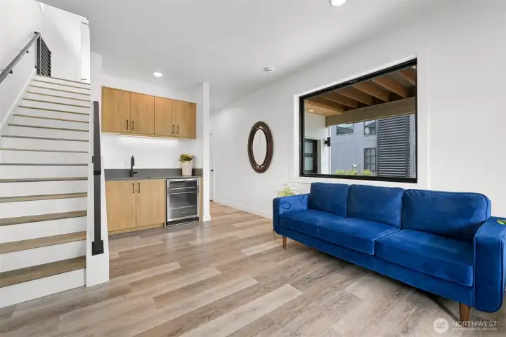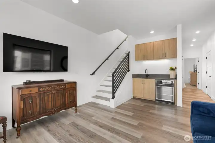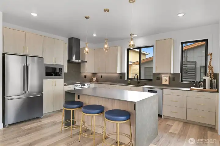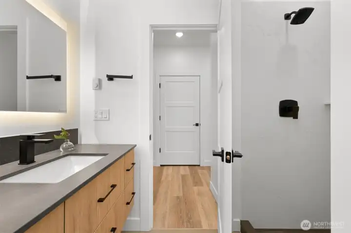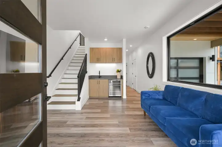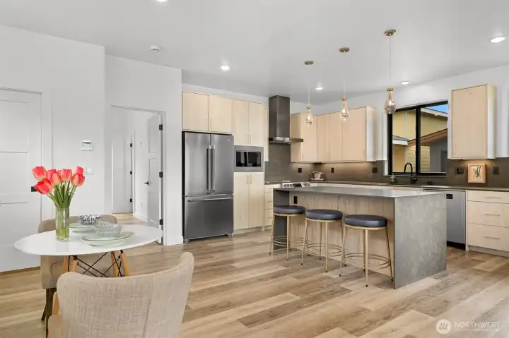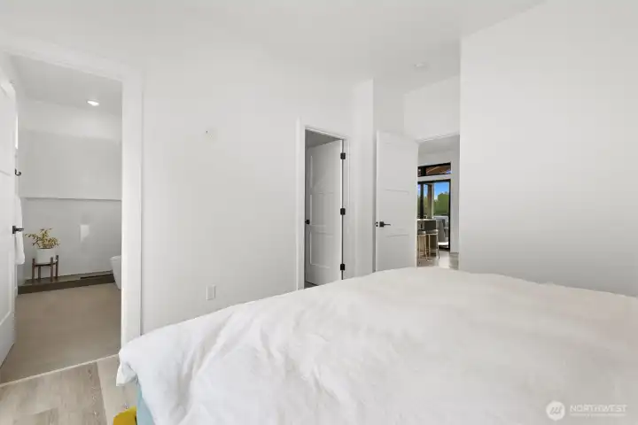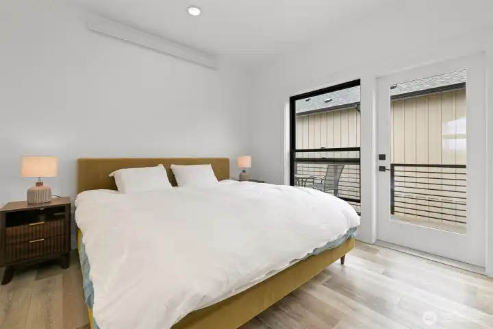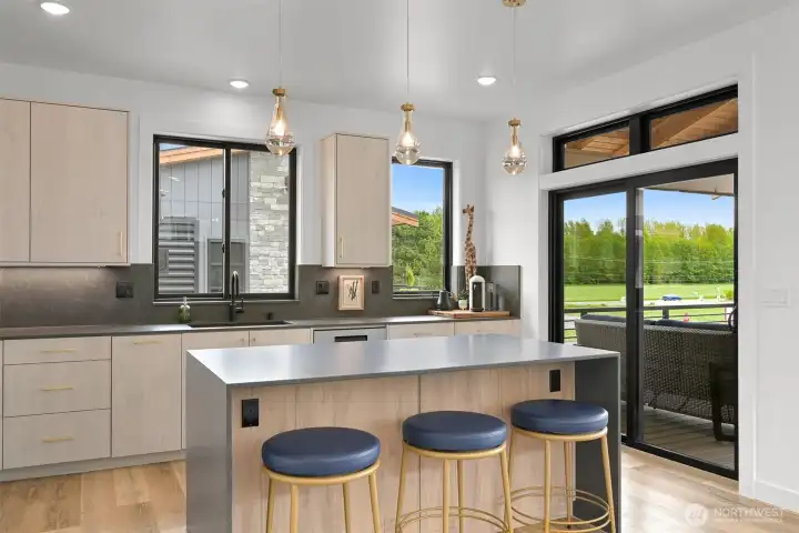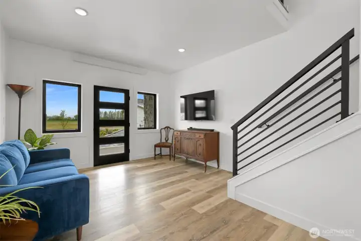 Discover River-Walk, a thoughtfully designed NW Washington community known for its upscale finishes, scenic surroundings, low maintenance living, and walkable connection to charming downtown Lynden. Enjoy easy access to local restaurants, boutique shops, and everyday conveniences, all just a short stroll or bike ride away. Situated on the desirable east side, this modern style home offers 1,428 sq. ft. of comfortable living with numerous upgrades throughout. Upstairs you'll find the primary suite with its own laundry, and beautiful living space flooded with natural light. The gourmet kitchen shines with quartz countertops, custom cabinetry, stainless steel appliances, and an expansive waterfall island, perfect for both everyday living and entertaining. The main level features the second bedroom and bathroom with a second laundry, and a bonus space with kitchenette, providing opportunities for multigenerational living or a great home office set up! Take in the beautiful view from the upper balcony deck, unobstructed and preserved by the green space in front of the home. Truly turn-key for anyone seeking the perfect blend of modern, upscale amenities with the slow pace of small town living.