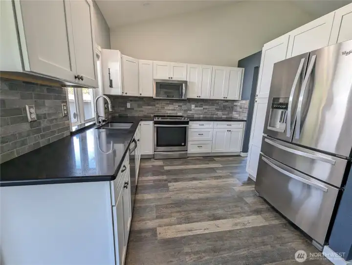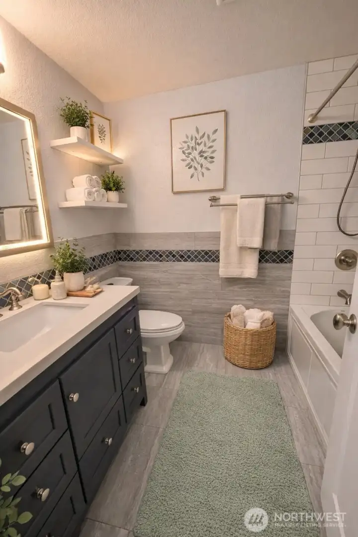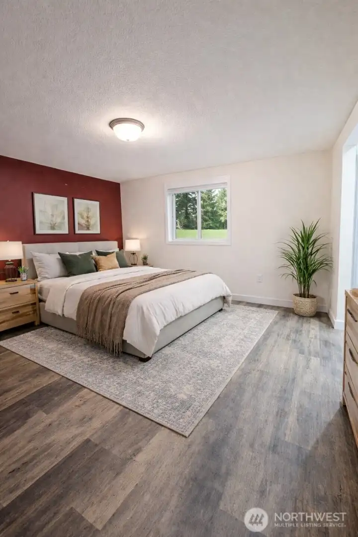 Elegantly updated and move-in ready, this single-level 3 bedroom, 2 bath rambler is perfectly positioned on a spacious corner lot in a highly desirable and tranquil Rochester neighborhood. Vaulted ceilings, warm laminate flooring, and a fireplace with a refined tile surround that create an inviting, elevated living space. The kitchen is thoughtfully designed with white cabinetry, slab countertops, stainless steel appliances, and a stylish tile backsplash, offering both beauty and functionality. The primary suite features a walk-in closet and a tastefully remodeled en-suite with a gorgeous tiled walk in shower, while the hall bath includes upgraded finishes and an oversized soaking tub. Year-round comfort with central A/C. The expansive, fully fenced backyard is a true outdoor retreat, complete with a hot tub, fire pit, extended patio and additional storage. This garden oasis includes an oversized and completely fenced in garden with greenhouse, garden shed, water and electricity. Home has wonderful extras including ample parking with an attached two-car garage and extended driveway, wired for generator, RV parking with electrical hookups. Conveniently located near trails, hunting, fishing, horse back riding, shopping and I-5. This property offers a seamless blend of comfort, style, and livability. *Home is virtually staged.*