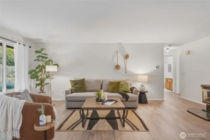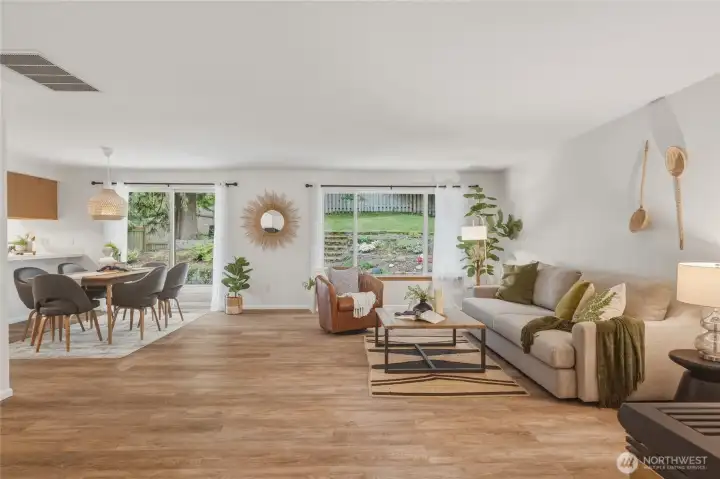 Main living space with tons of windows showing terraced back yard. Newer vinyl planked flooring throughout main living areas and bedrooms of home.