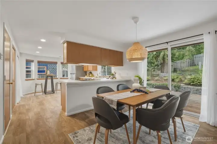 Dining space open to living room and kitchen with sliding door out to deck and fenced back yard.