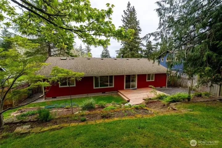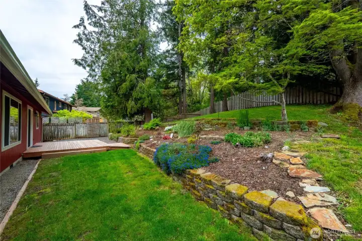 Beautiful terraced back yard, trees for privacy and gate to greenbelt area beyond.