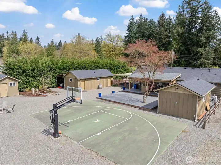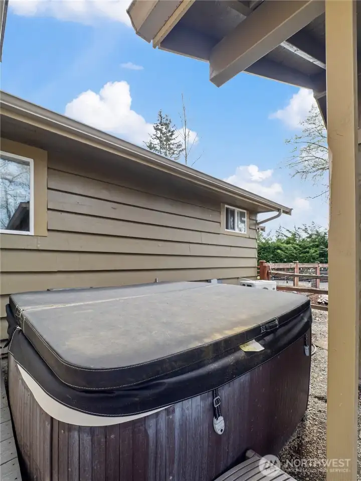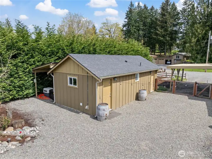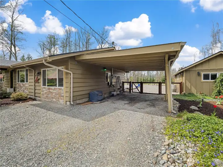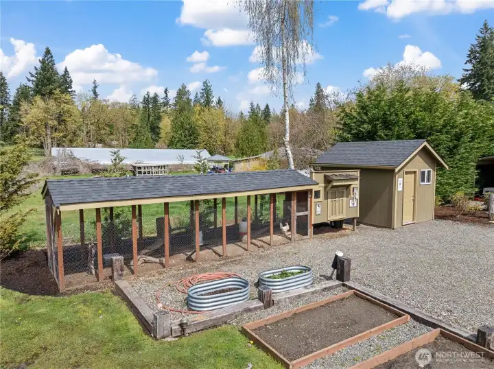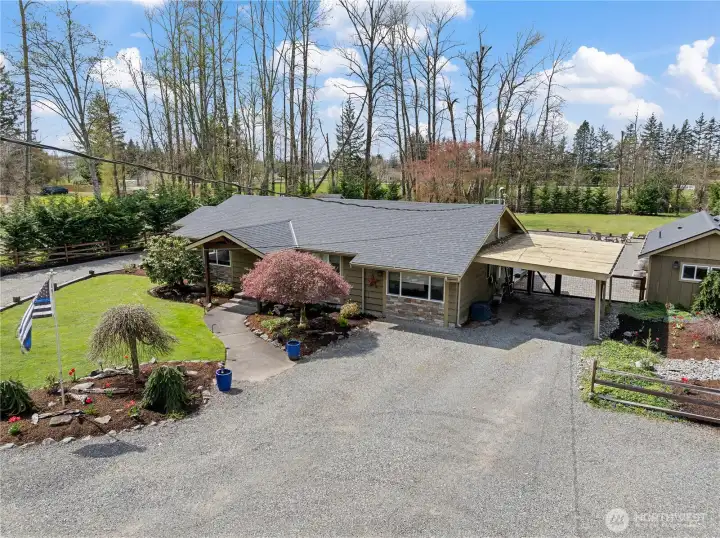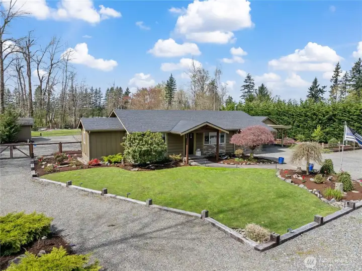 Completely renovated (from the studs out in 2019) Enumclaw rambler on a pristine 32,571SF lot w/ Mt Rainier view offering 2,020SF of living space and 3.25 total baths. Primary suite w/ custom water closet tub & shower, dual sink vanity & vaulted walk-in closet. Detached 290SF junior sweet w/ vaulted ceiling plus a detached double den/office perfect for all your work/school from home needs. Updated kitchen w/ granite countertops, island seating & GE Cafe' appliances opens to a large living room and dining room with built-ins and wet bar. All new plumbing & wiring in 2019 along with a new roof & windows. Outside you'll find 2 garden sheds, an oversized chicken coop, beautiful mature landscaping, sports court, large, covered deck w/ 1-year old hot tub included. 1-car attached carport, wired for EV charging & generator plug. Tons of extra vehicle parking with room enough for your RV. Xfinity and City of Enumclaw water. A great close-in country setting well suited for multi-generational living & year-round entertainment.