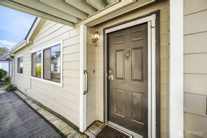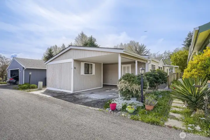 Covered carport entry with easy access and low-maintenance exterior—welcome to comfortable 55+ living.