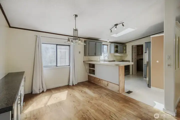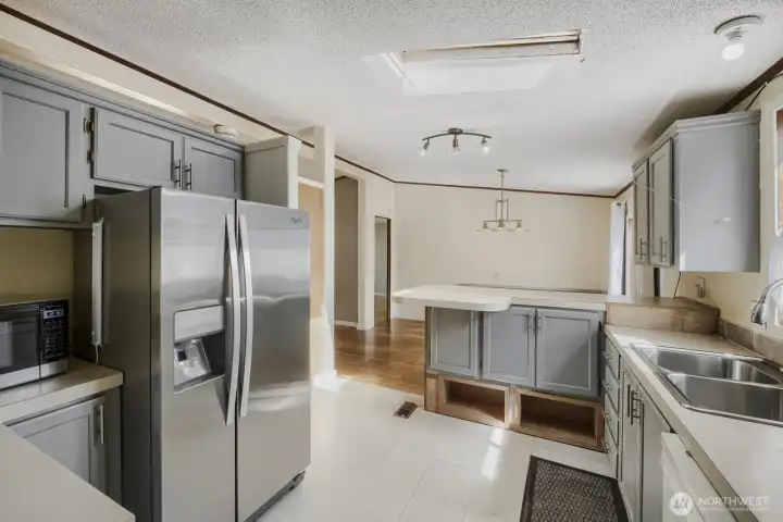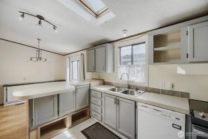 Functional kitchen with ample cabinetry, breakfast bar seating, and skylight bringing in natural light.